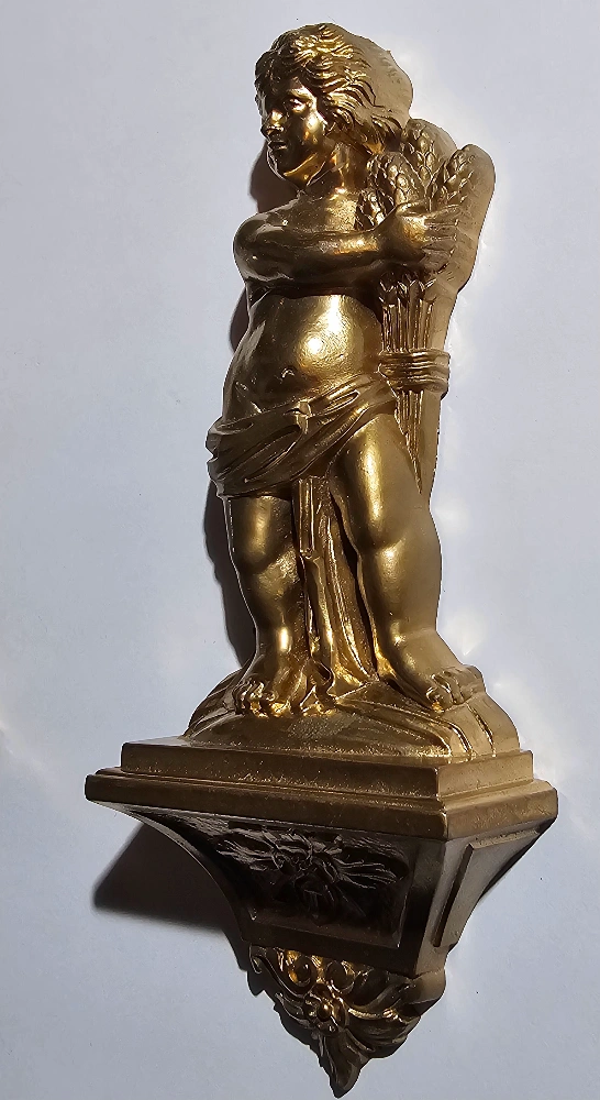 Selling a set of two cherub wall sconces in a gold finish. They're perfect for adding a touch of classic charm to any room. One cherub is holding grapes and the other is holding wheat.