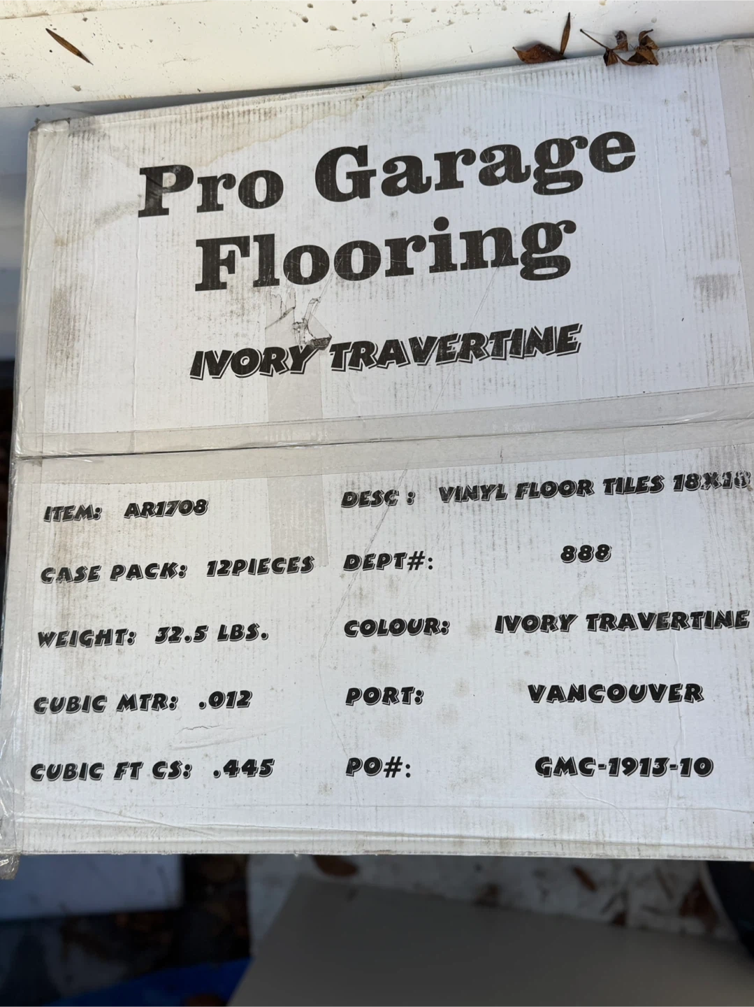 65Selling 20 box’s of Pro Garage Flooring vinyl floor tiles in Ivory Travertine! They are 18x18 inches. The case pack includes 12 pieces. Colour: Ivory Travertine 20 boxes is approximately 540 ft.²