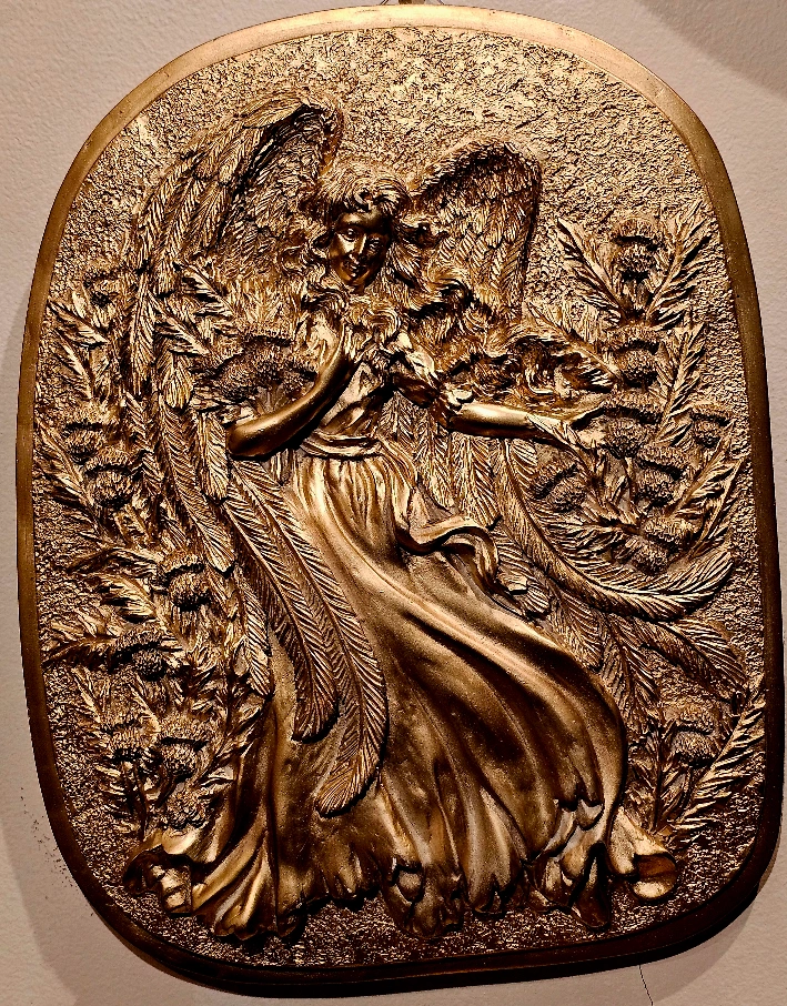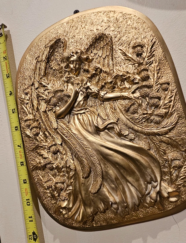 Beautiful angel wall art in a gold colour! It measures approximately 12 inches in length. This unique piece would add a touch of elegance to any room. It's in great condition and ready to find a new home