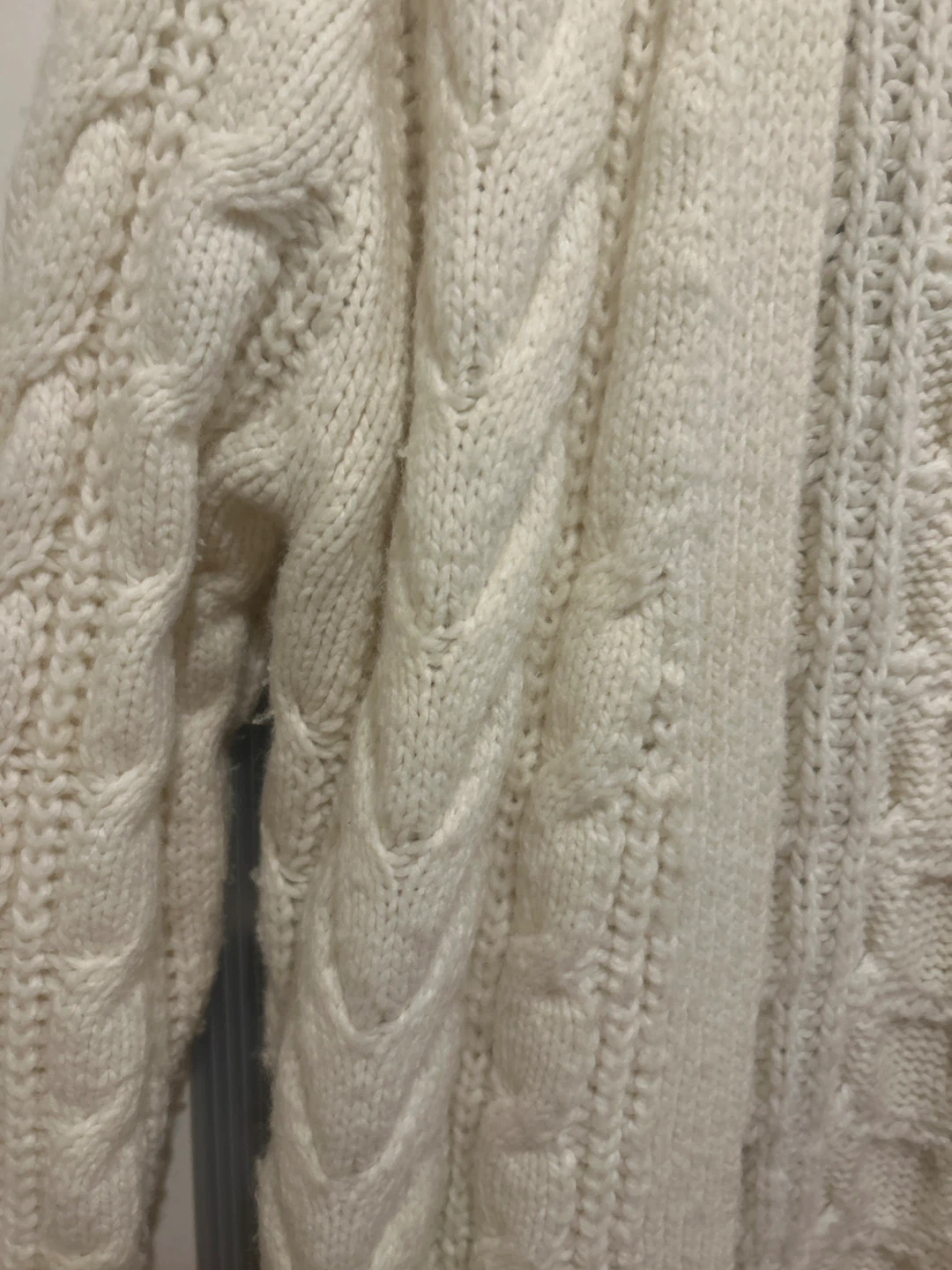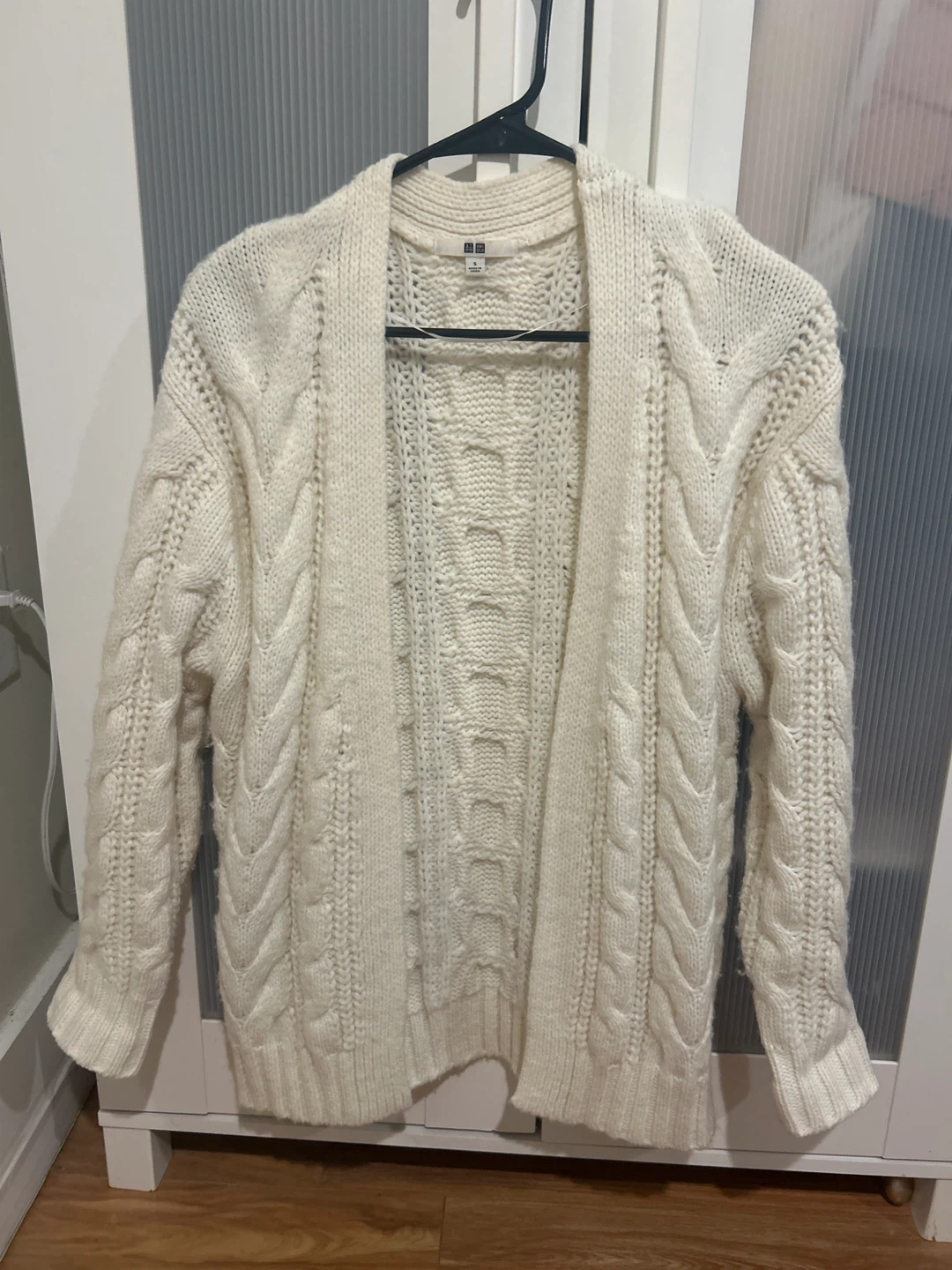 A cozy cream-coloured cable knit cardigan from Uniqlo in size small. It's perfect for layering!
