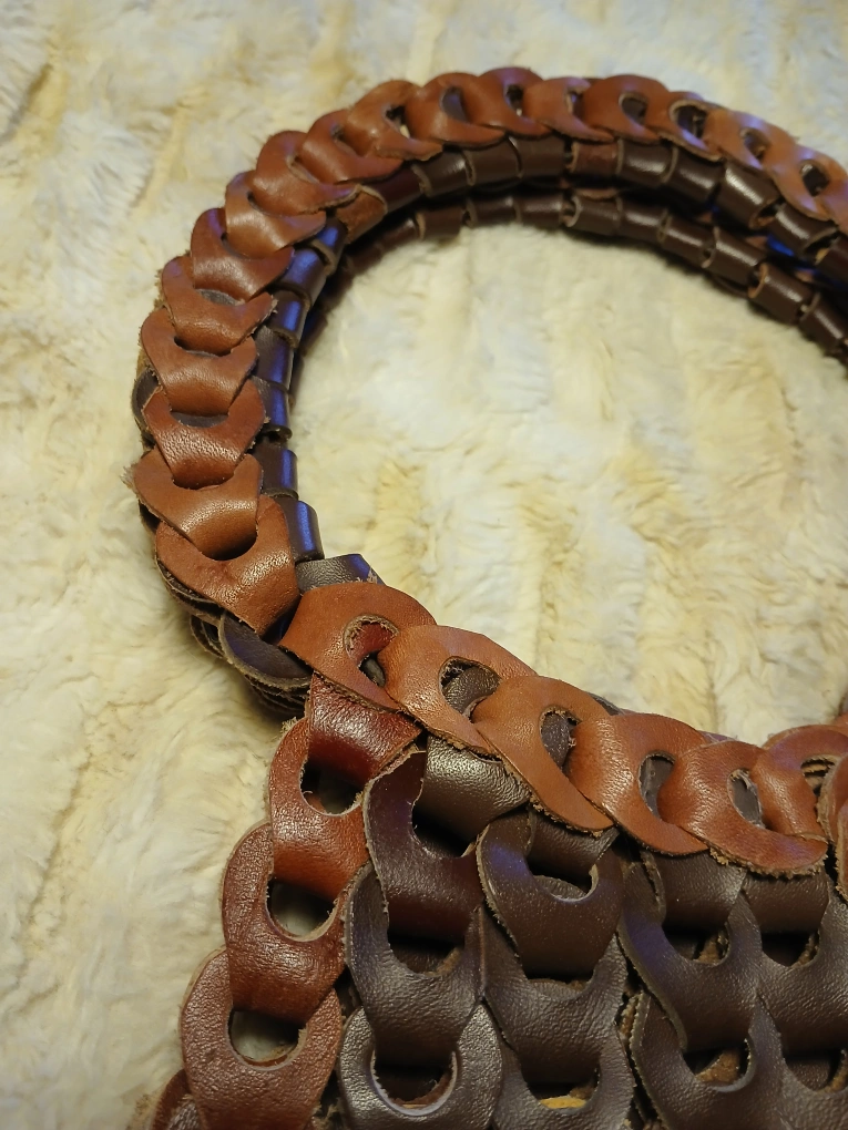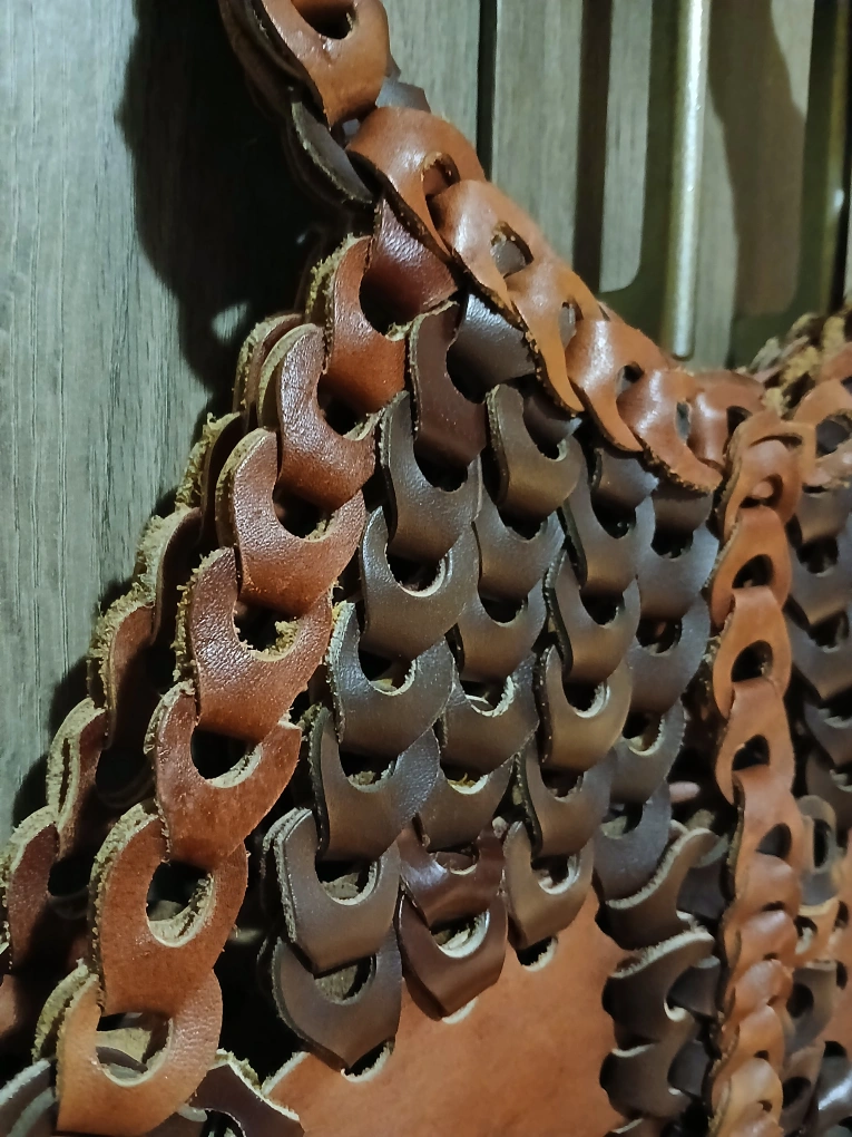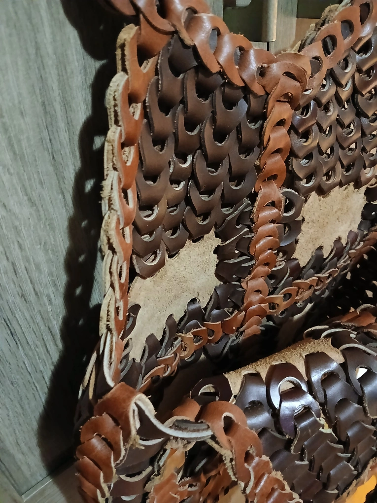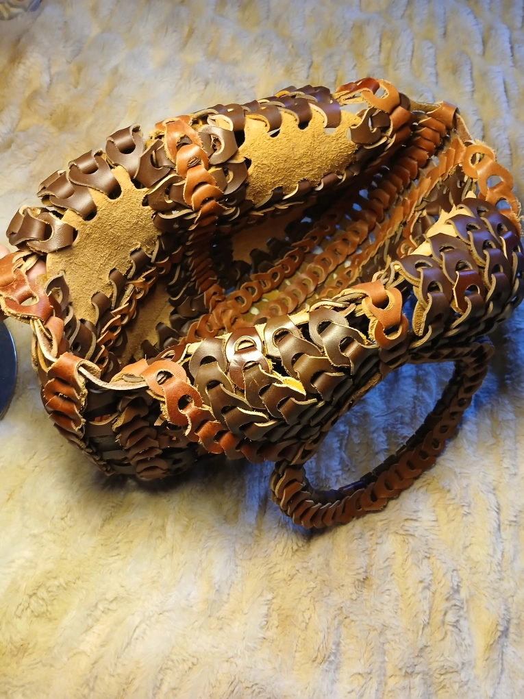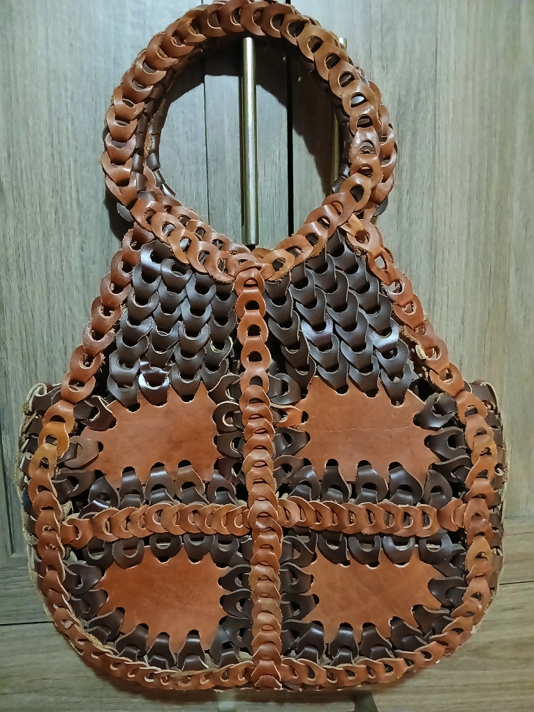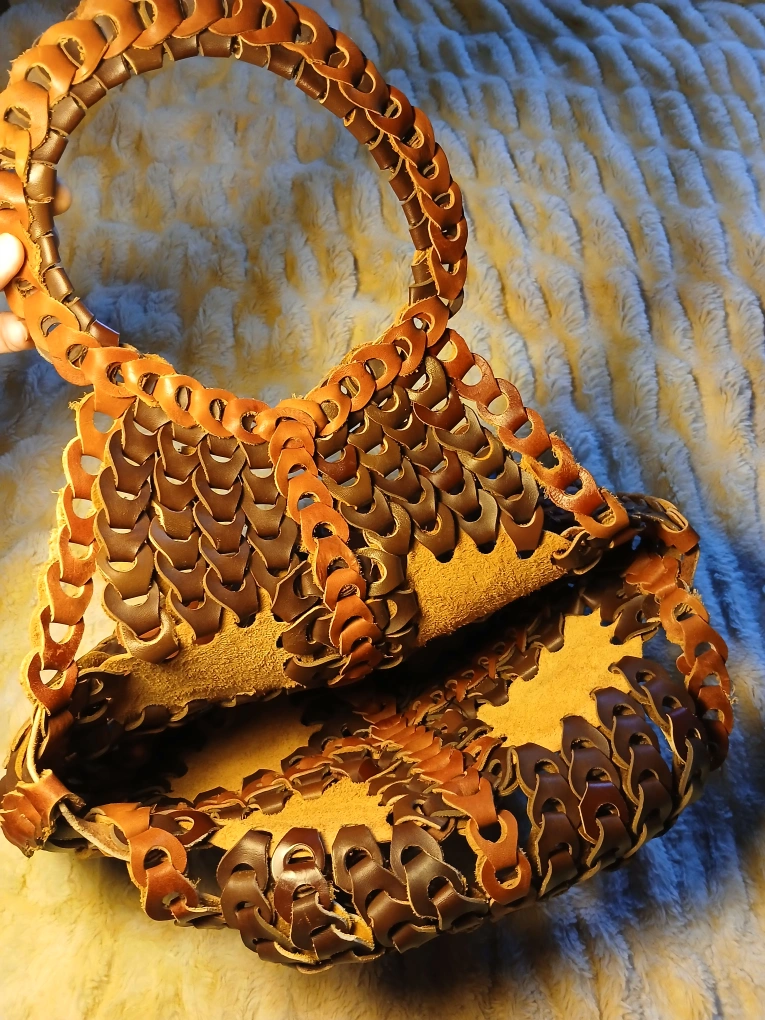 654Vintage Bohemian style 1970's Handmade Woven Leather Bag. Some call it "Hippie" This is such an awesome eye-catching, uniquely designed Bag to accessorize any casual look. The two tones of leather adds a gorgeous richness. Sturdy double rounded handles in the woven leather offer a comfy hold. Unbranded but in the Patricia Nash style with the chainlink and woven design. The true Patricia Nash Bohemian Bag New $475+ and used $250+. The last photos show comps of other Unbranded Bags in this style.. This Bag is in fantastic vintage condition, with just some normal wear. Measures approx. 20" L with handles, 13" L Bag x 14" W