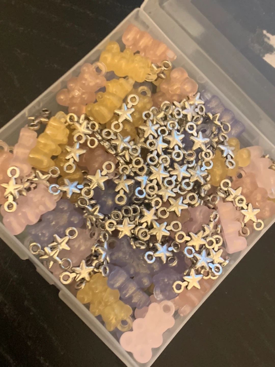 Selling a collection of cute gummy bear charms with star connectors! They're perfect for adding a playful touch to your DIY jewelry or craft projects. They come in a variety of pastel colours, all neatly stored in a container
