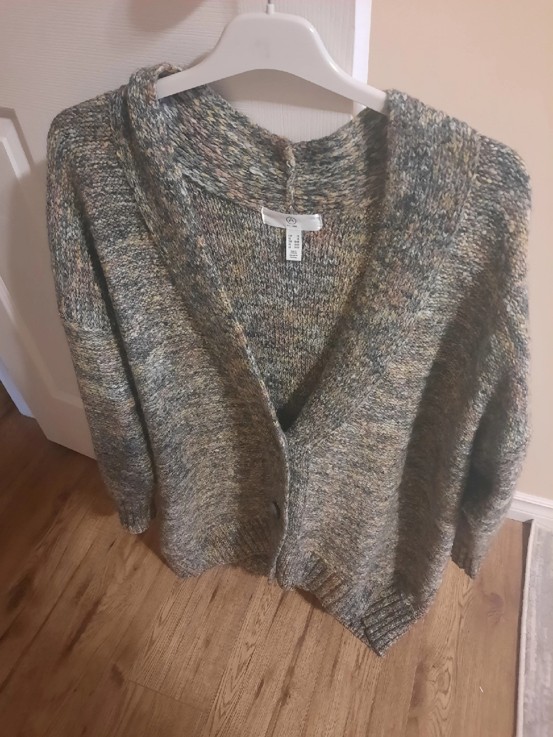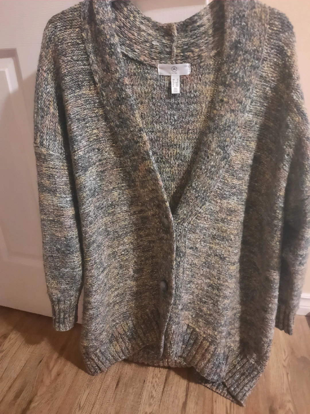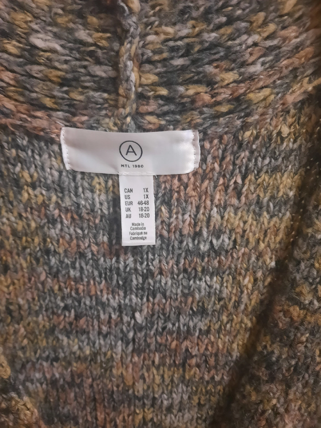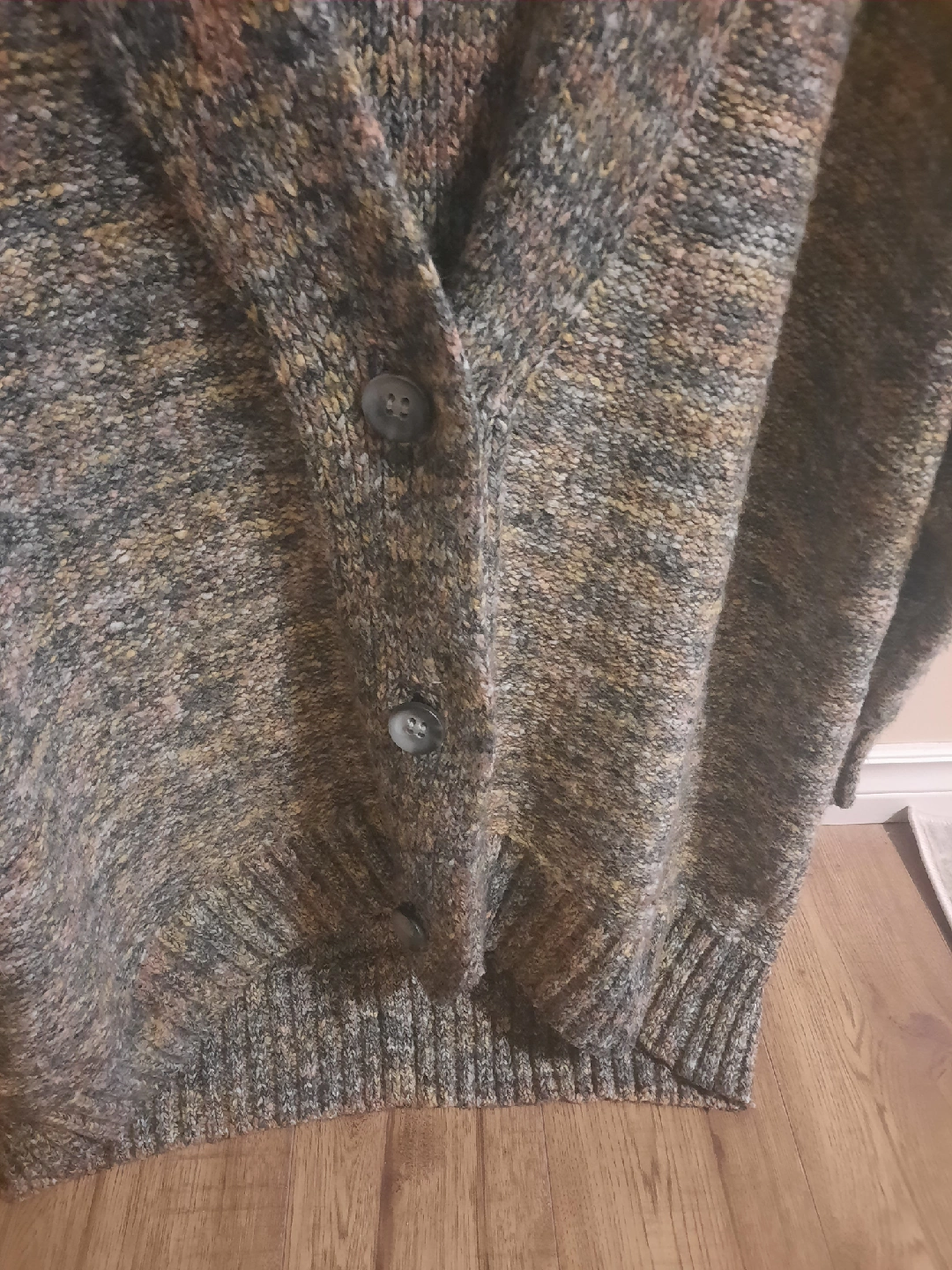 MHL by Margaret Howell is a clothing line that focuses on a more utilitarian and casual style compared to the main Margaret Howell collection. The brand is known for its use of natural fabrics and a relaxed aesthetic. The cardigan is a type of sweater that opens in the front, and the one shown is a multicolored knit design. fits a bit big it is a 1X
