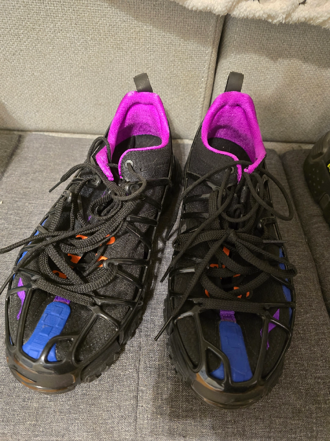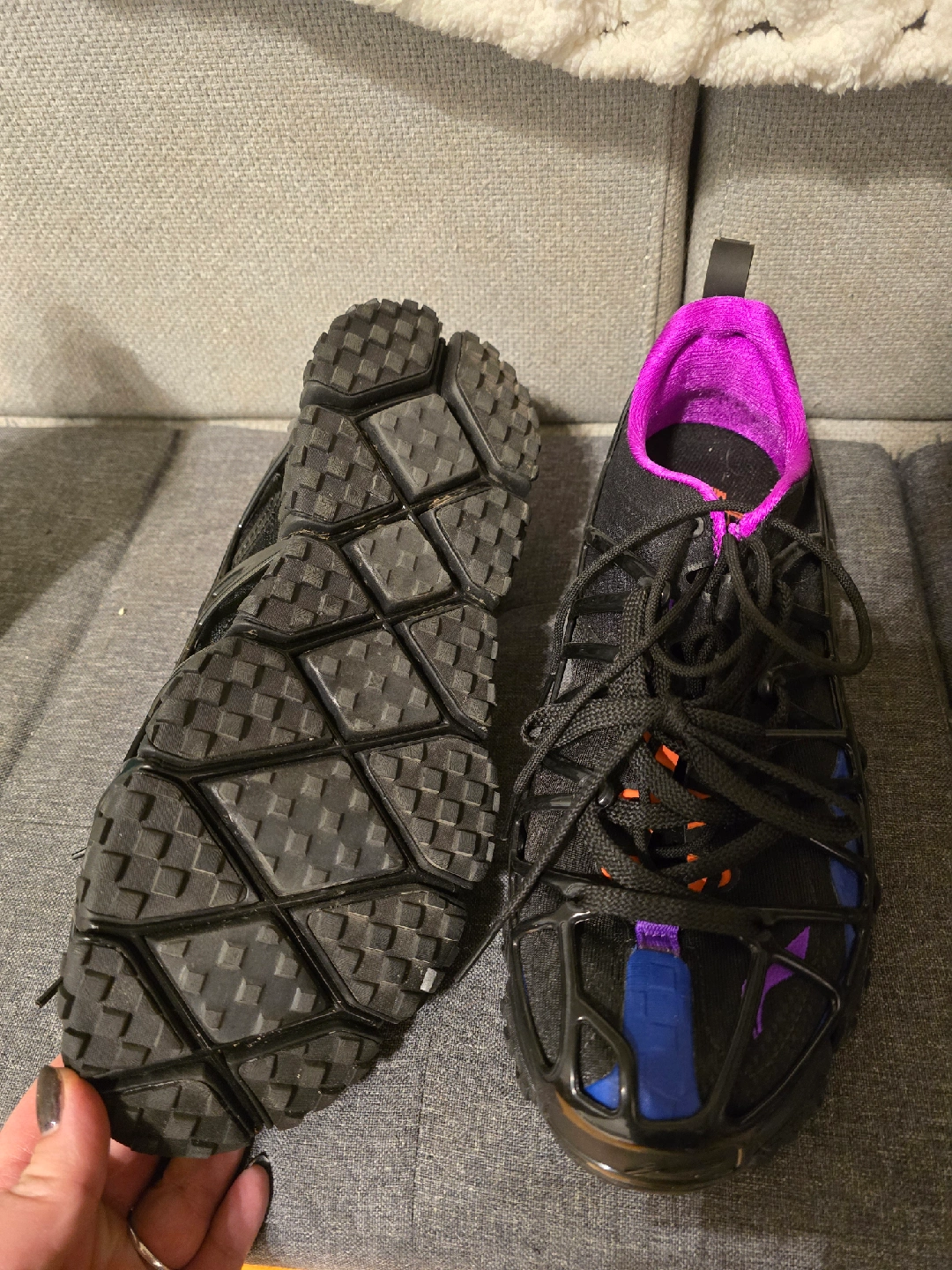 Selling a pair of Li-Ning Mix Ace 'Paris Fashion Week - Black' shoes in size 10 US. These shoes feature a unique design with black, purple, and blue accents. The soles have a distinctive geometric pattern for traction. They're in great shape and ready for a new home!