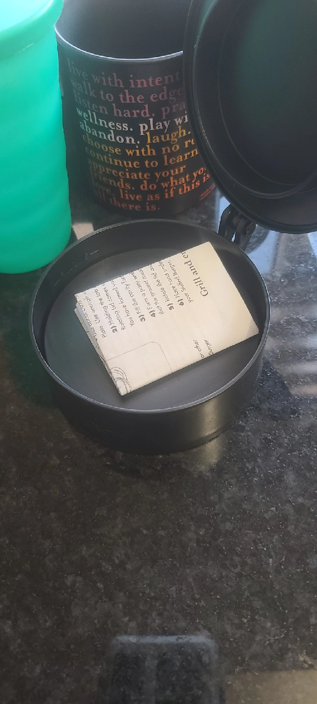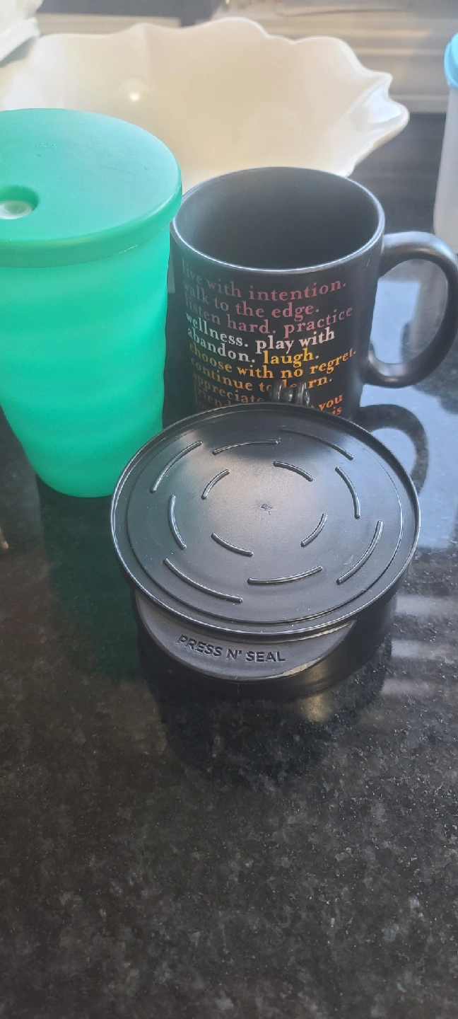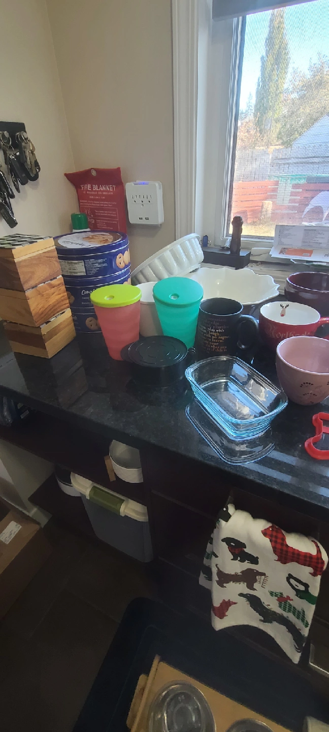 Box filled with unused and gently used kitchen items. Some Tupperware items. There's a lot! Trying to downsize what we have.