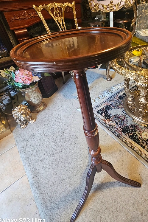 Selling a lovely dark brown wooden pedestal accent table. It's perfect for displaying decorative items or holding drinks. The table has a classic design with a round top and a sturdy three-legged base. It's in great condition and would make a charming addition to any room