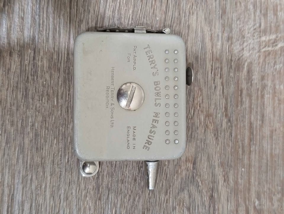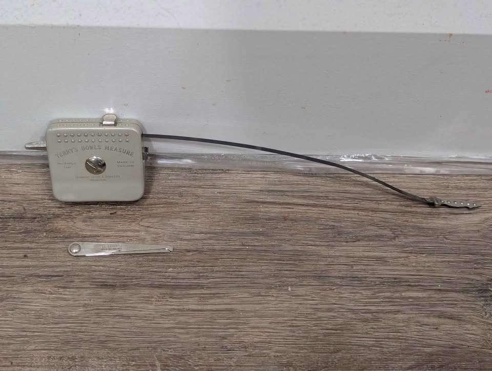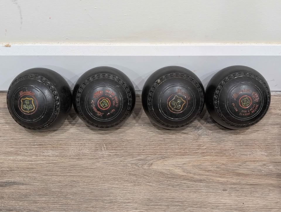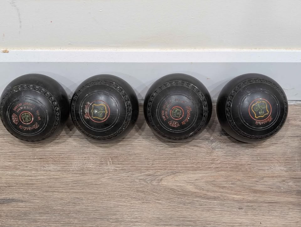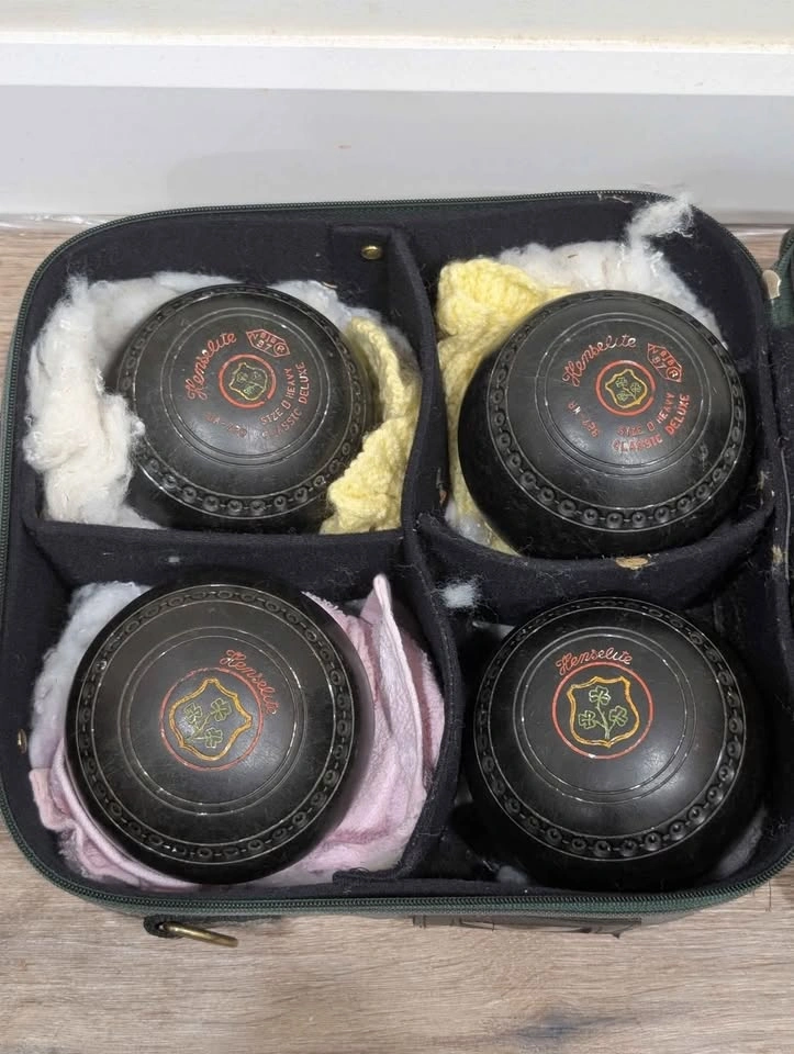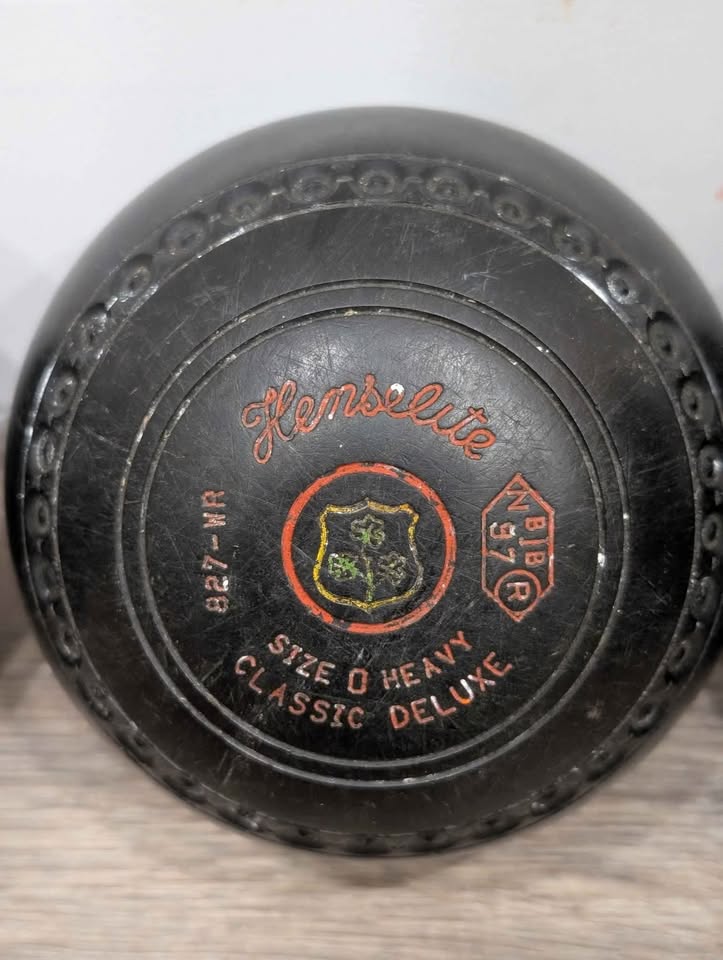 Set of 4 Henselite bowls, used but well maintained and in good condition. Smooth rolling surfaces with clear engraved markings. Includes a handy measuring tool with built-in measuring tape for accurate scoring. Durable construction for years of play. Great starter set or a reliable backup for club games. Clean and ready for your next match.