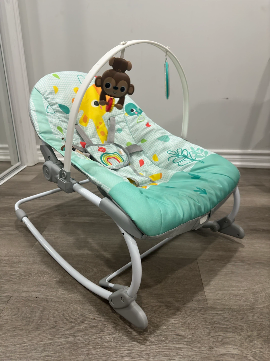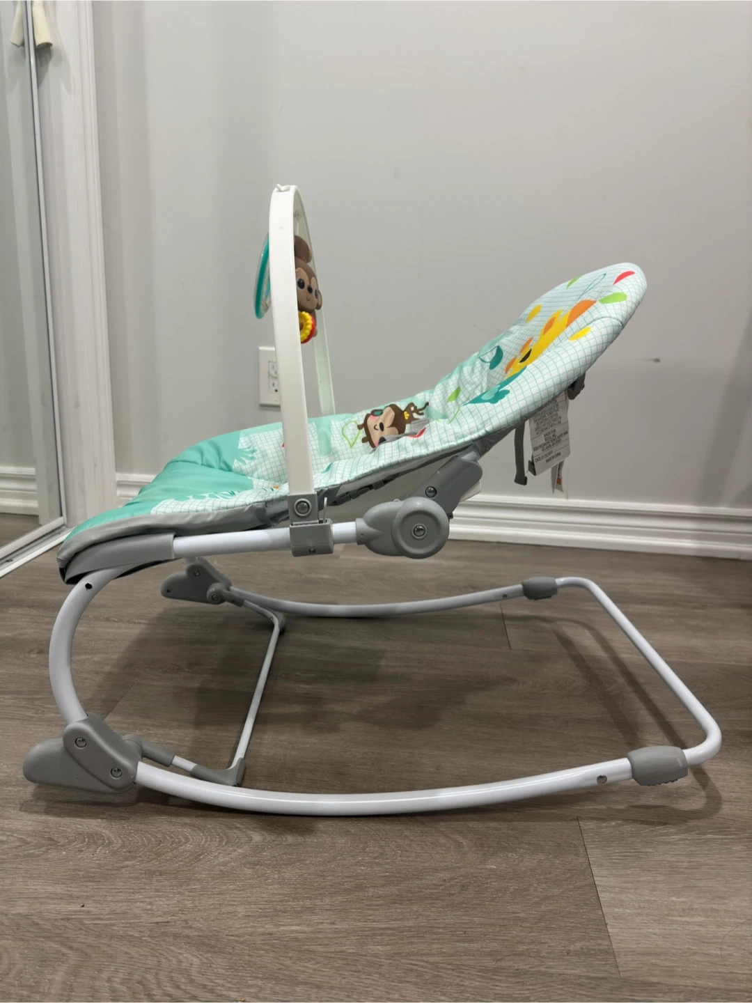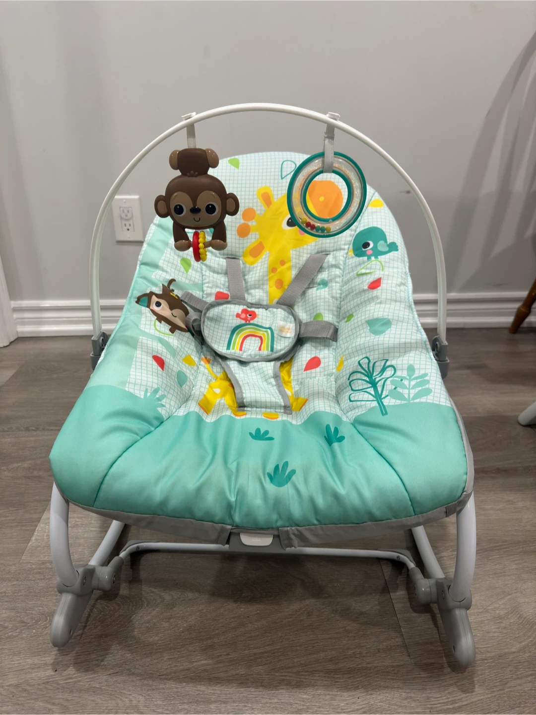 It’s a soothing safari for your wild child with the Wild Vibes 2-in-1 rocker and stationary seat from Bright Starts. This powerhouse multi-use seat grows with baby and is great for infants and toddlers alike! Adults can soothe baby in the rocker mode, while the toy bar entertains from above with the colorful rattle and monkey bead chaser toy. The vibrating seat helps keep baby calm while you have a hands-free moment with baby in view. One-button vibration functionality is built into the seat, so you can easily switch vibrations on or off to baby’s preference. To recline, use the buttons below the toy bar on each side of the seat to adjust forward and back. Use the front kickstand to seamlessly switch from rocker to stationary seat. When you're on the move, simply lift on each side when baby is not in the bouncer to move from room to room. This do-it-all chair grows with baby up to 40 lbs, so you’ll get years of use from newborn to toddler rocking chair. Keep the good times rocking with a removable seat pad that’s machine washable for any baby spit up or big kid messes. Great gift idea for baby shower or baby arrival!