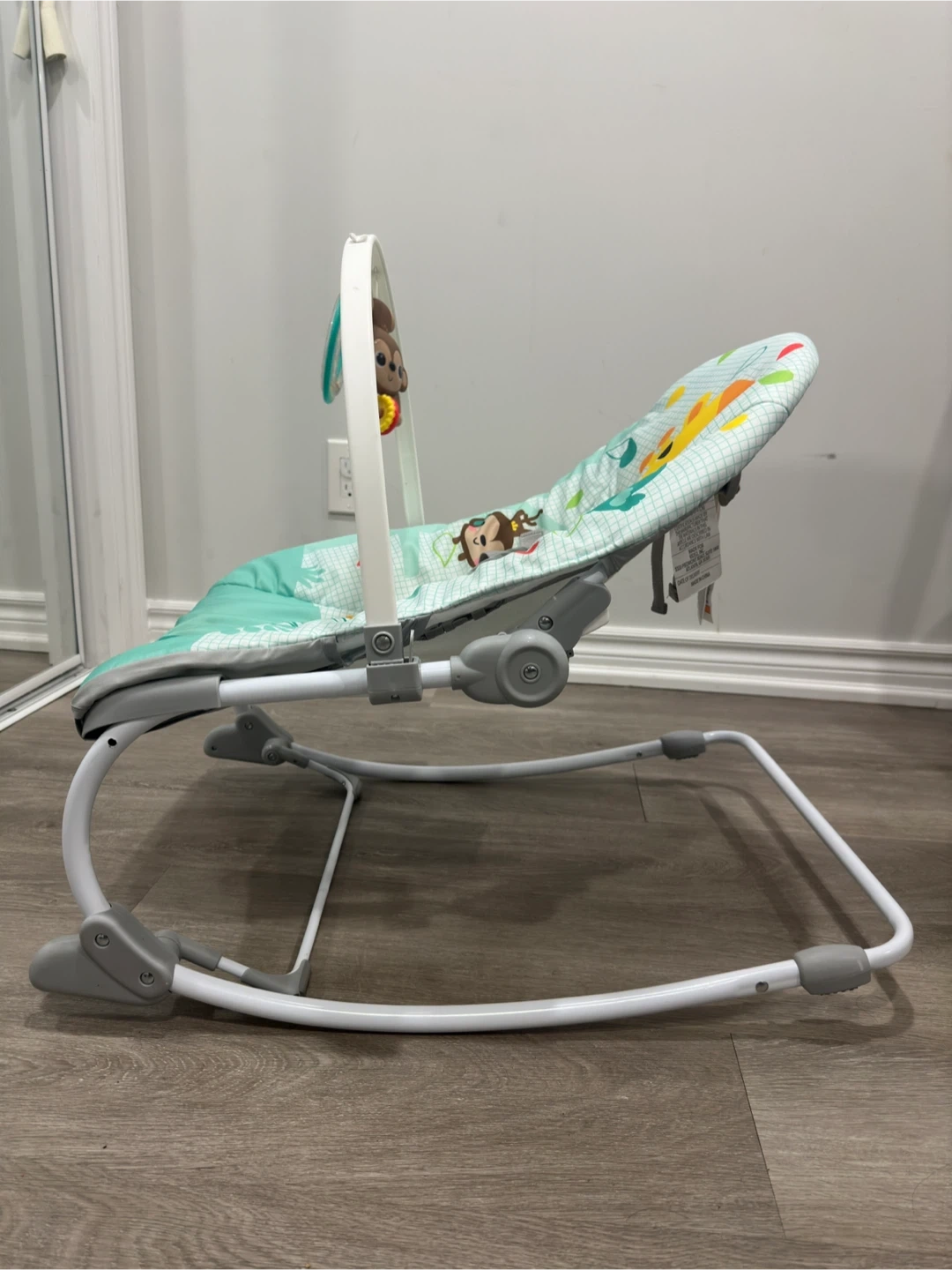 76It’s a soothing safari for your wild child with the Wild Vibes 2-in-1 rocker and stationary seat from Bright Starts. This powerhouse multi-use seat grows with baby and is great for infants and toddlers alike! Adults can soothe baby in the rocker mode, while the toy bar entertains from above with the colorful rattle and monkey bead chaser toy. The vibrating seat helps keep baby calm while you have a hands-free moment with baby in view. One-button vibration functionality is built into the seat, so you can easily switch vibrations on or off to baby’s preference. To recline, use the buttons below the toy bar on each side of the seat to adjust forward and back. Use the front kickstand to seamlessly switch from rocker to stationary seat. When you're on the move, simply lift on each side when baby is not in the bouncer to move from room to room. This do-it-all chair grows with baby up to 40 lbs, so you’ll get years of use from newborn to toddler rocking chair. Keep the good times rocking with a removable seat pad that’s machine washable for any baby spit up or big kid messes. Great gift idea for baby shower or baby arrival! Walmart price is $49.97 + taxes but I’m selling for $30 open to negotiations. Product is with original package and items.
