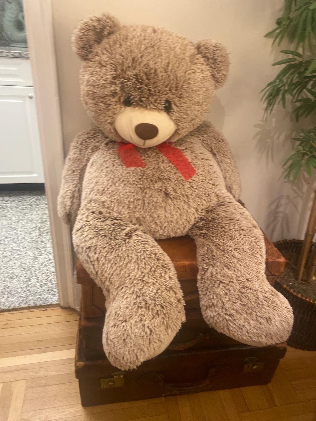 Selling a large, cuddly teddy bear! It's in great condition and features a cute red ribbon. Perfect for a gift or to add some cozy charm to any room