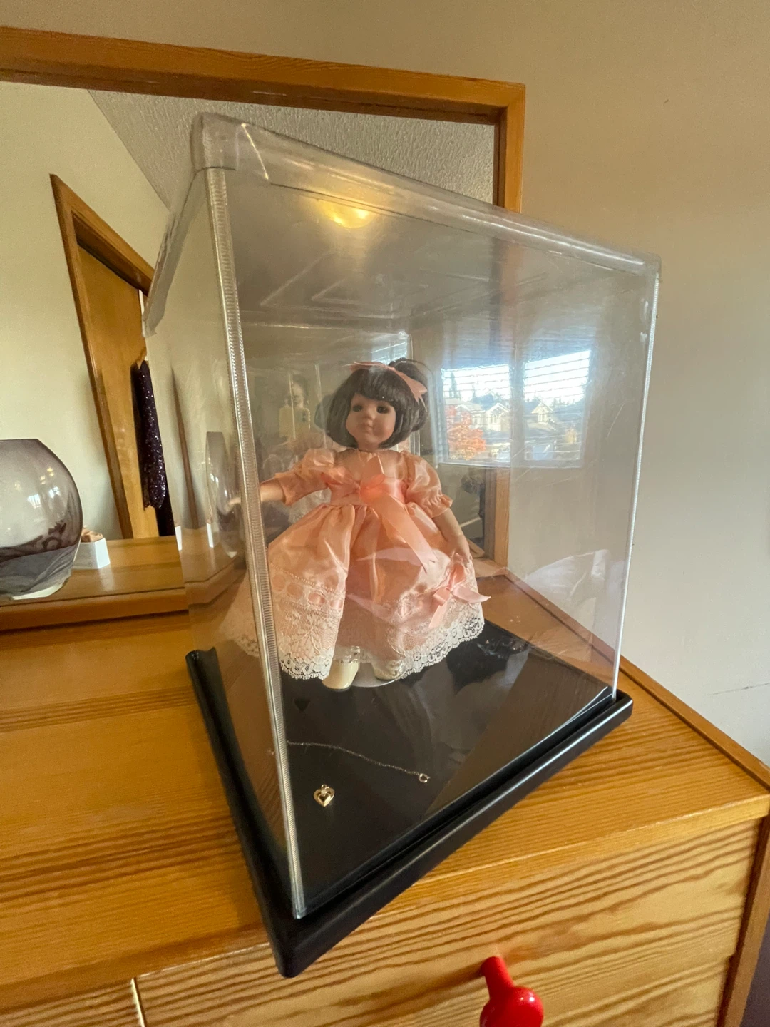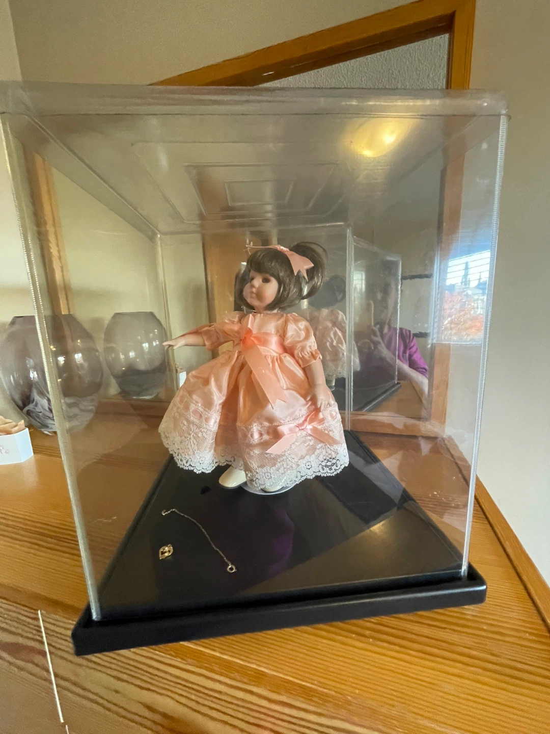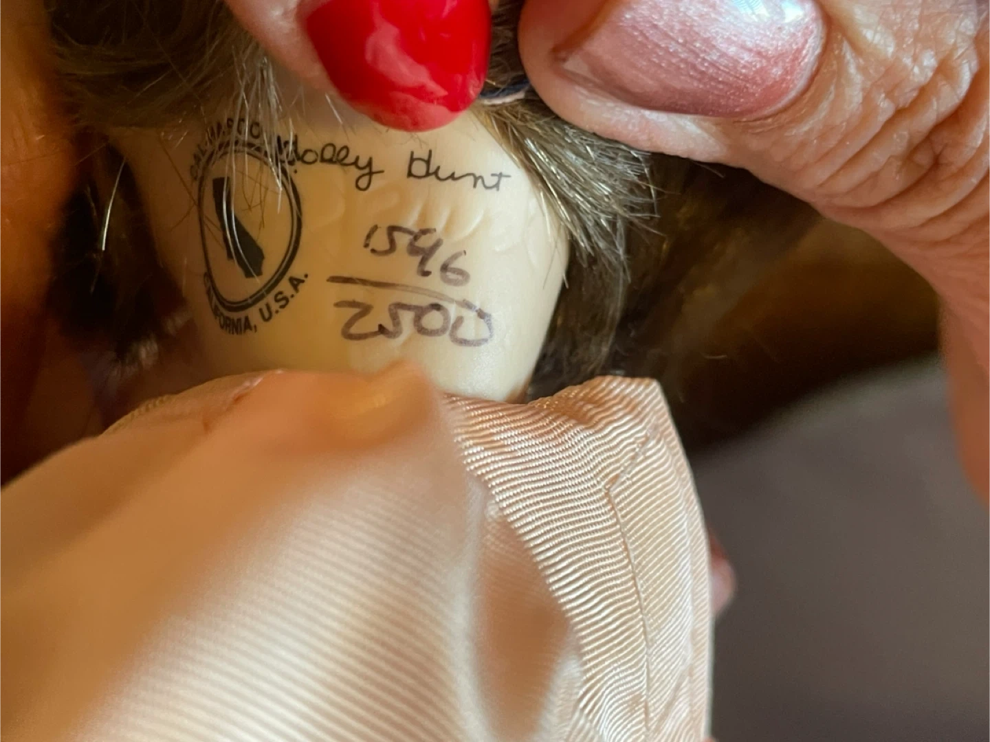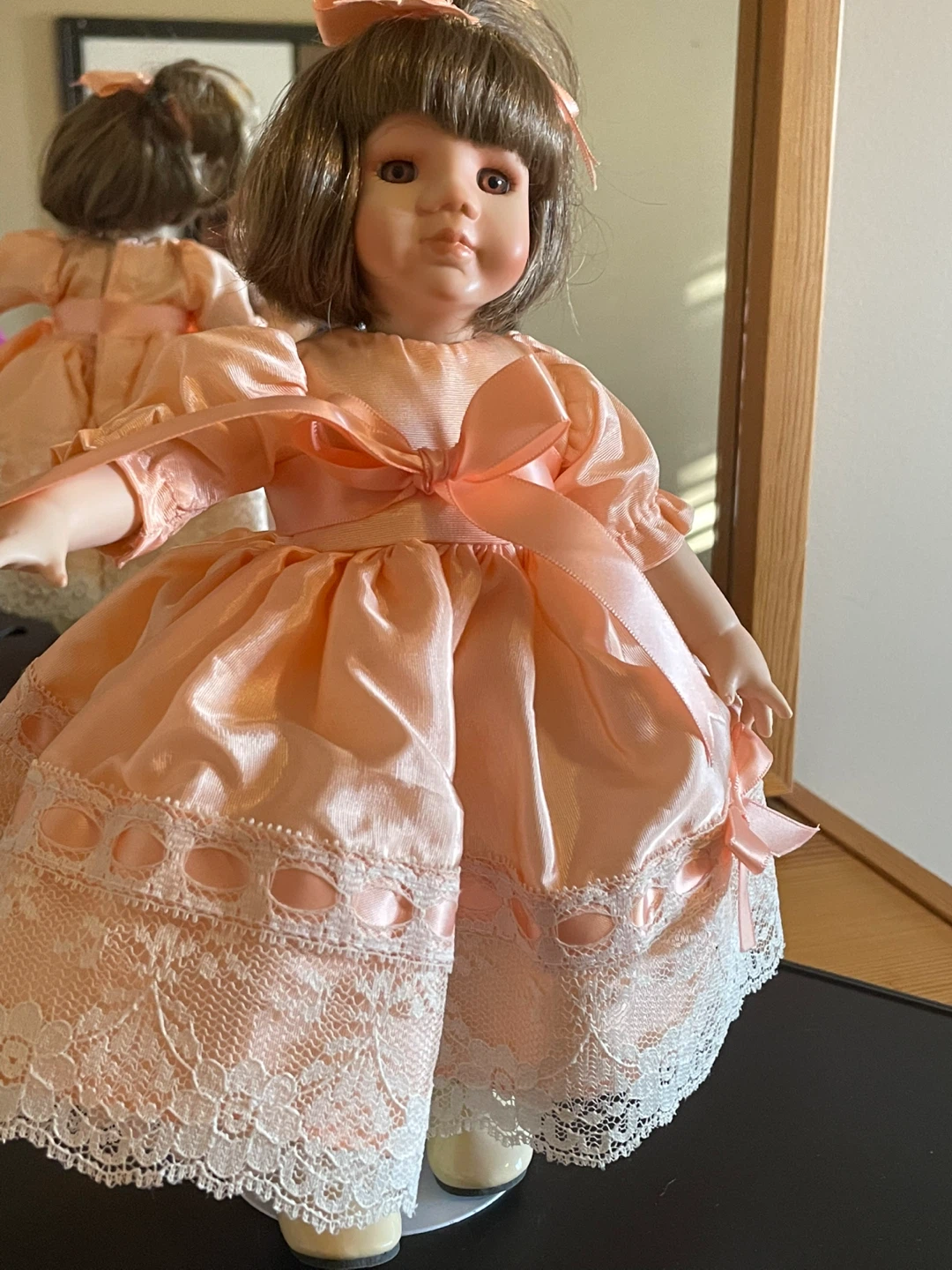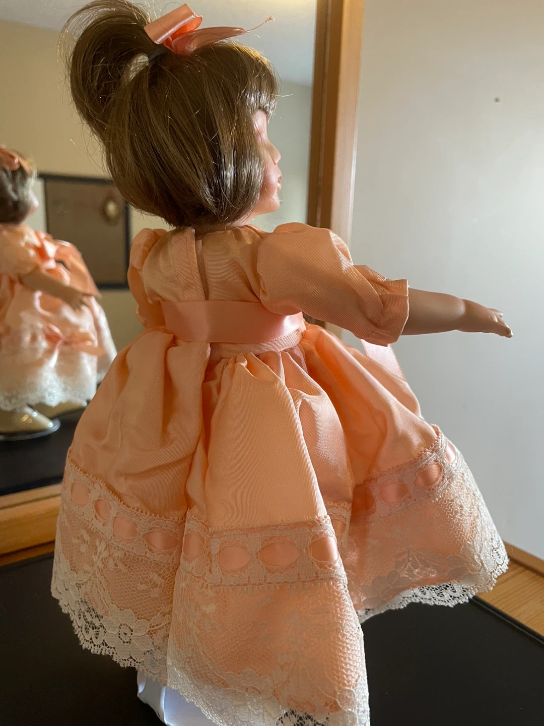 Selling a lovely “October” Holly Hunt doll, a limited edition piece numbered 1546 out of 2500. She's wearing a beautiful peach-coloured dress with lace detailing. A charming addition to any doll collection!