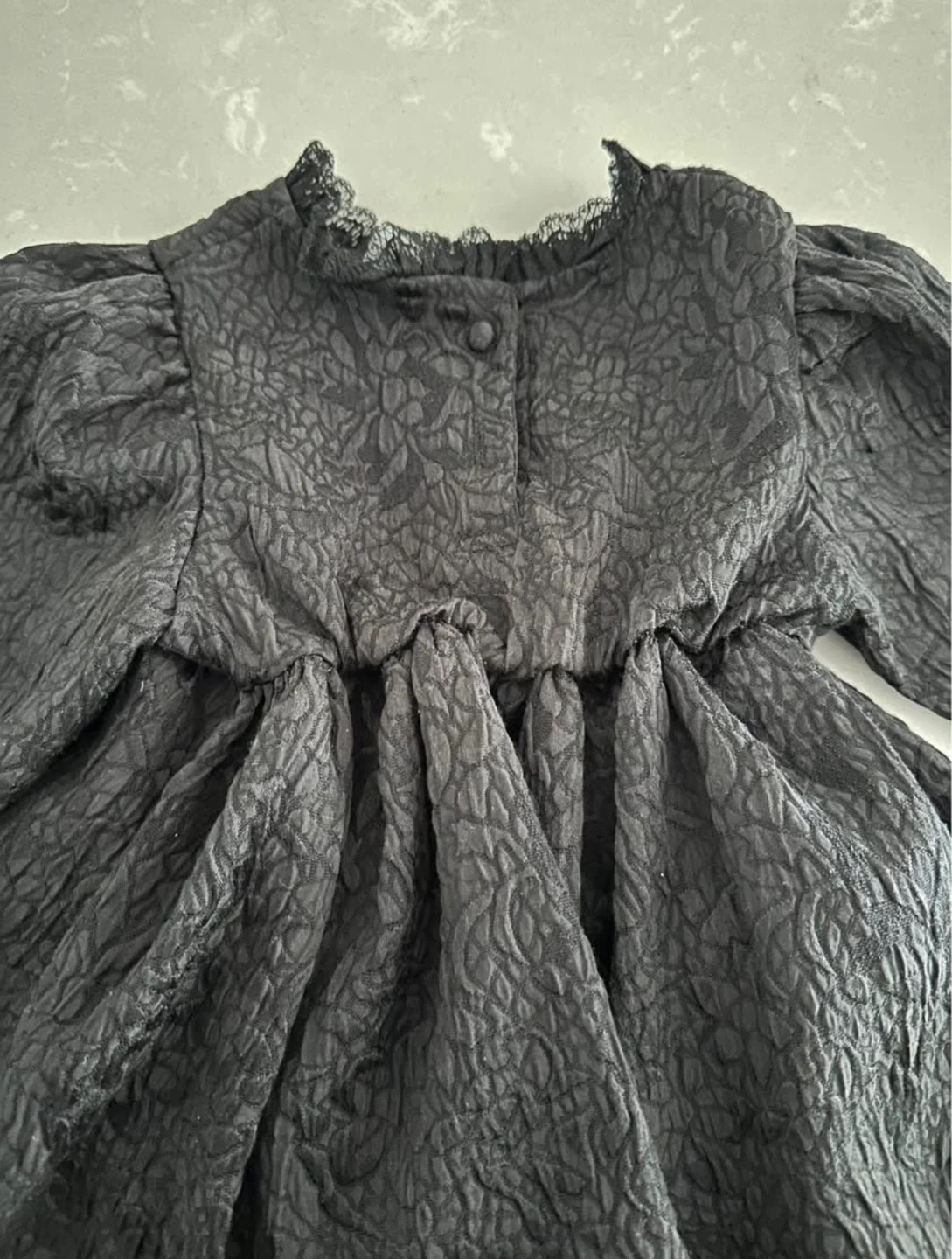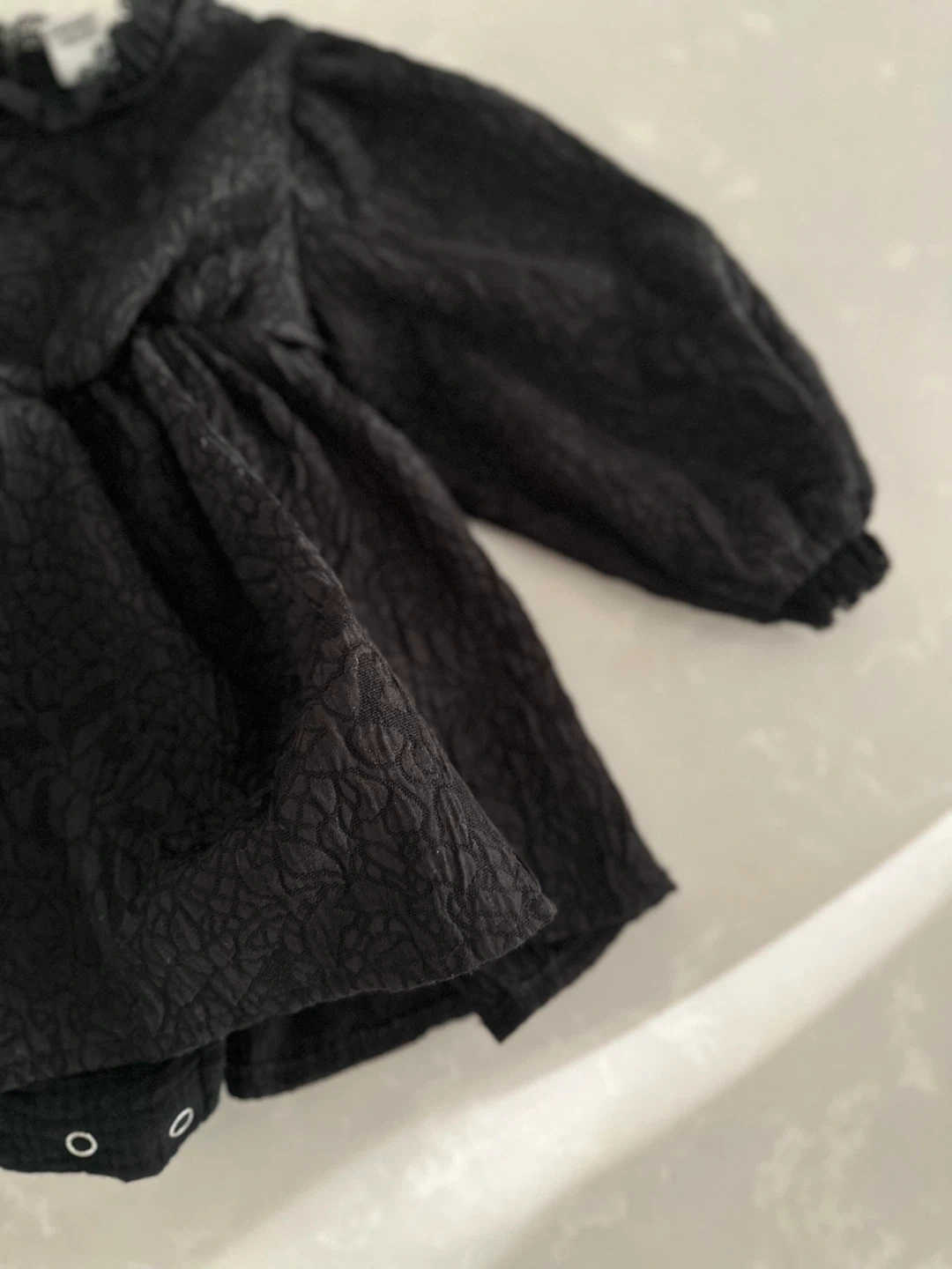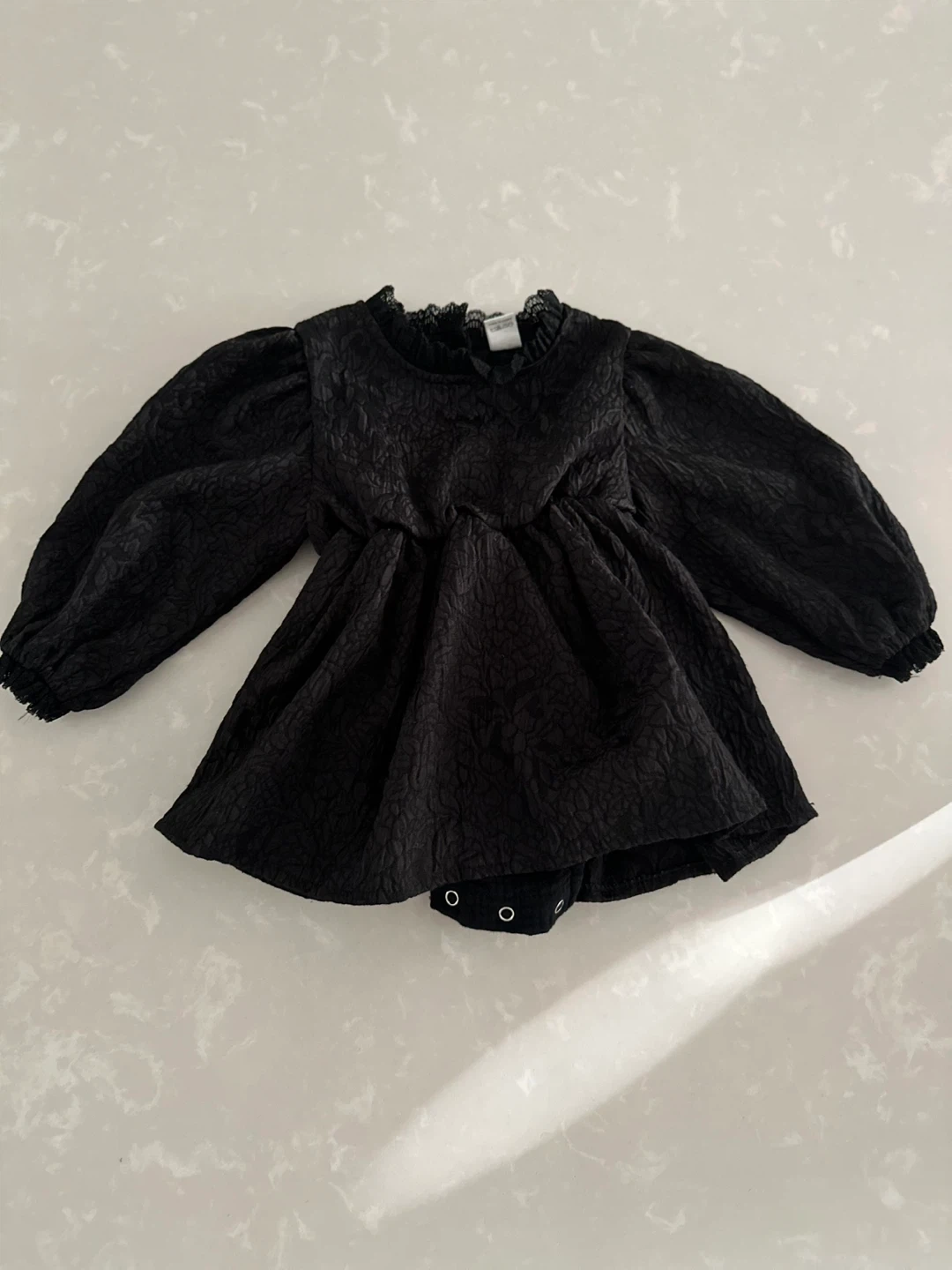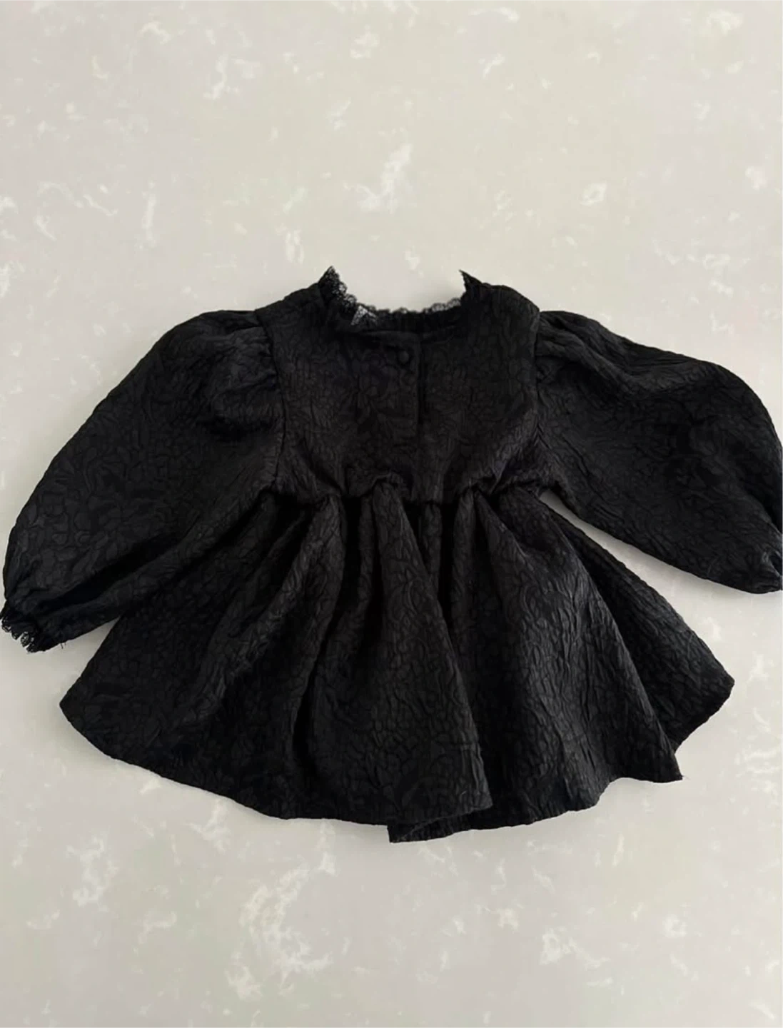 10This is a cute black baby dress with long, puffy sleeves. It has a textured pattern and a ruffled neckline. Perfect for a special occasion or just looking stylish! Made in Korea In a pet-free and smoke-free home