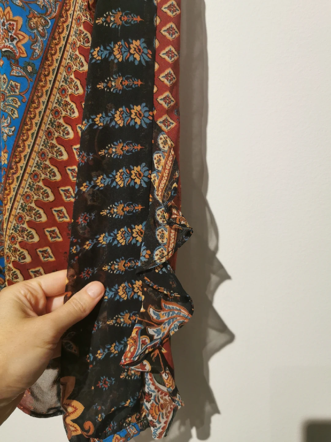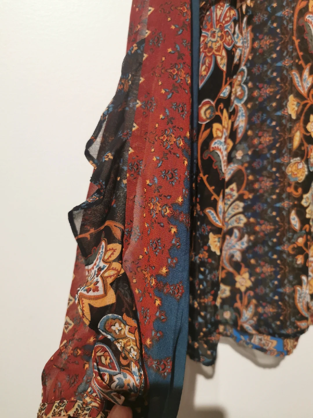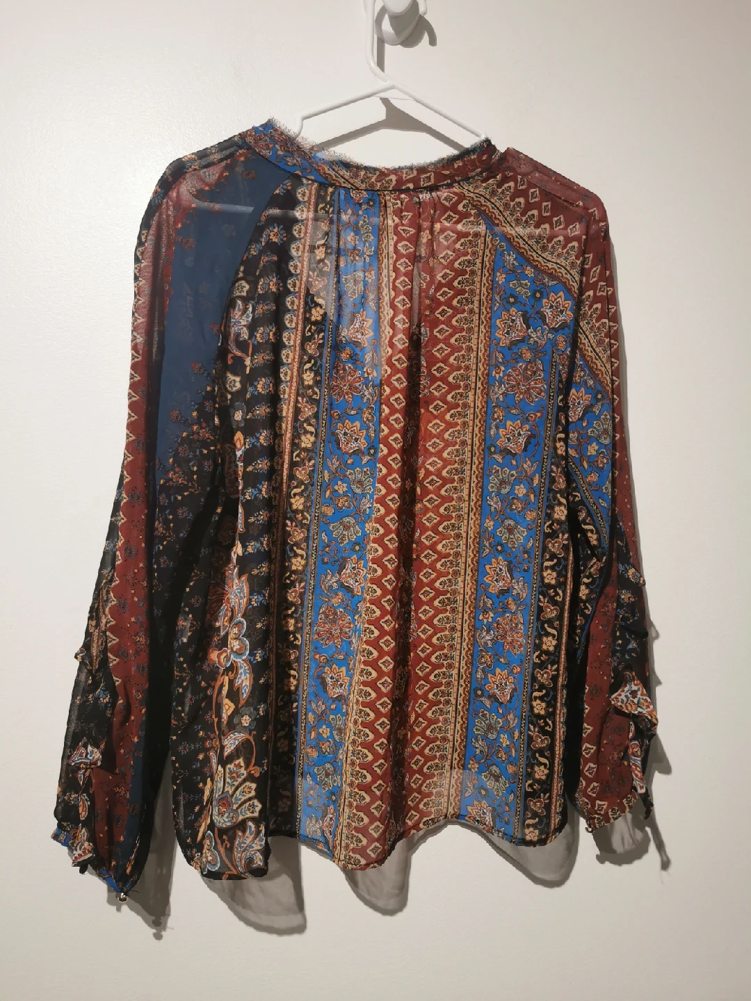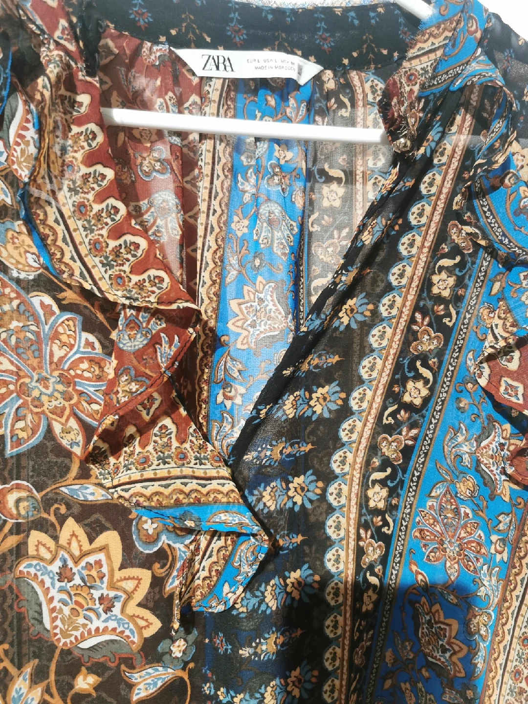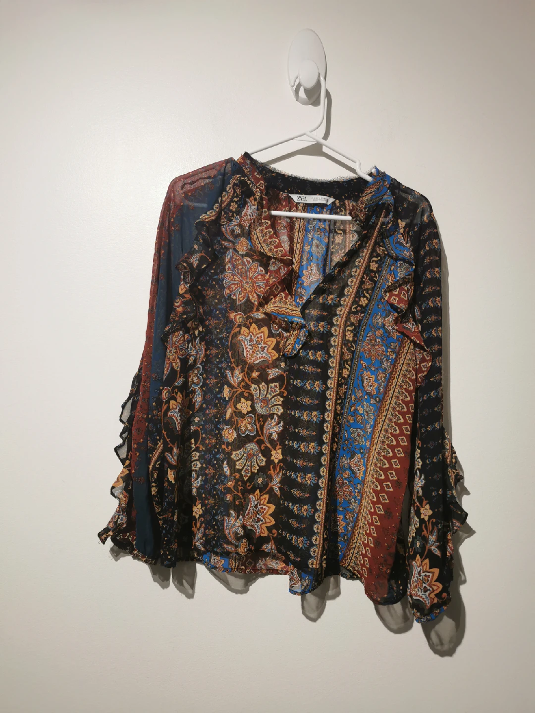 This Zara blouse features a vibrant floral print with a mix of colours. It's a size M and in great condition. The blouse has a unique design with ruffled sleeves, making it a stylish addition to any wardrobe!