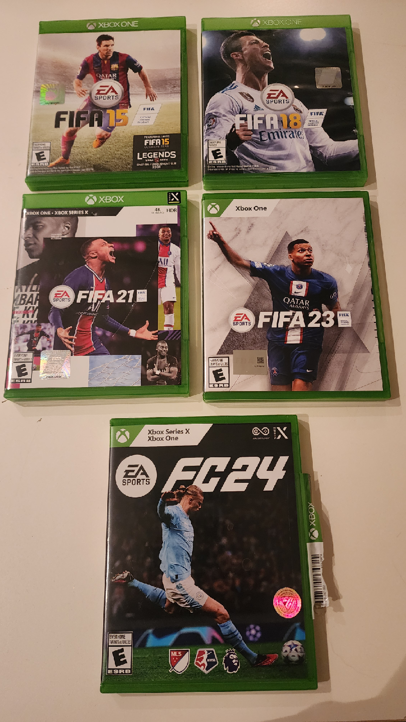 Selling a collection of FIFA and FC Xbox games! Includes FIFA 15, FIFA 18, FIFA 21, FIFA 23, and FC 24. All games are in good condition and ready for a new player