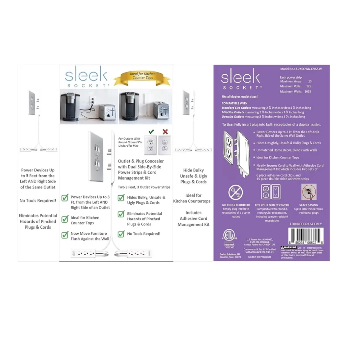 10Declutter your kitchen counters with this Sleek Socket outlet and plug concealer! It hides bulky, unsafe, and unsightly plugs and cords. This kit includes two 3-foot, 3-outlet power strips, plus an adhesive cord management kit. No tools required for installation!