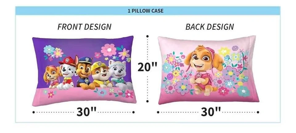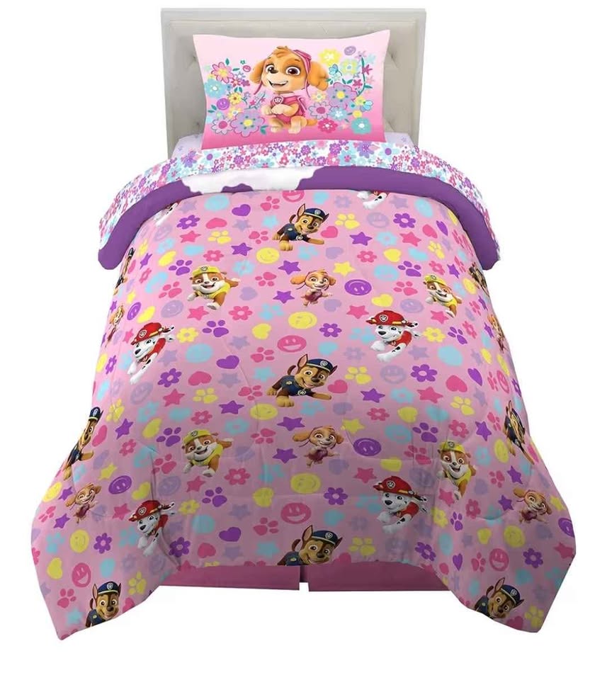 PAW PATROL GIRLS DESIGN: This cute and colorful bedding set teams up Paw Patrol fans with their favorite puppy pals Skye, Chase, Everest, Marshall and Rubble. New, out of the package. Retail compare at Amazon after tax $80. The adorable heroes from the hit Nickelodeon series are ready for action with animated character imagery and pretty floral accents on this "Flower Doggies" patterned bedding.