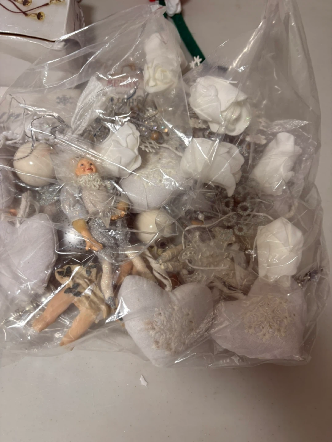 Selling a bag of mostly high end assorted Christmas ornaments. They are all white themed and include hearts, roses, and other decorative items. Perfect for creating a winter wonderland at home