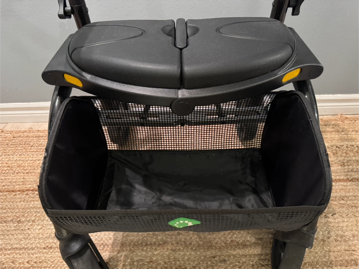 Evolution Xpresso Walker rollator in black. It features a comfortable seat and a convenient basket for storage. Perfect for anyone needing a little extra support while getting around!