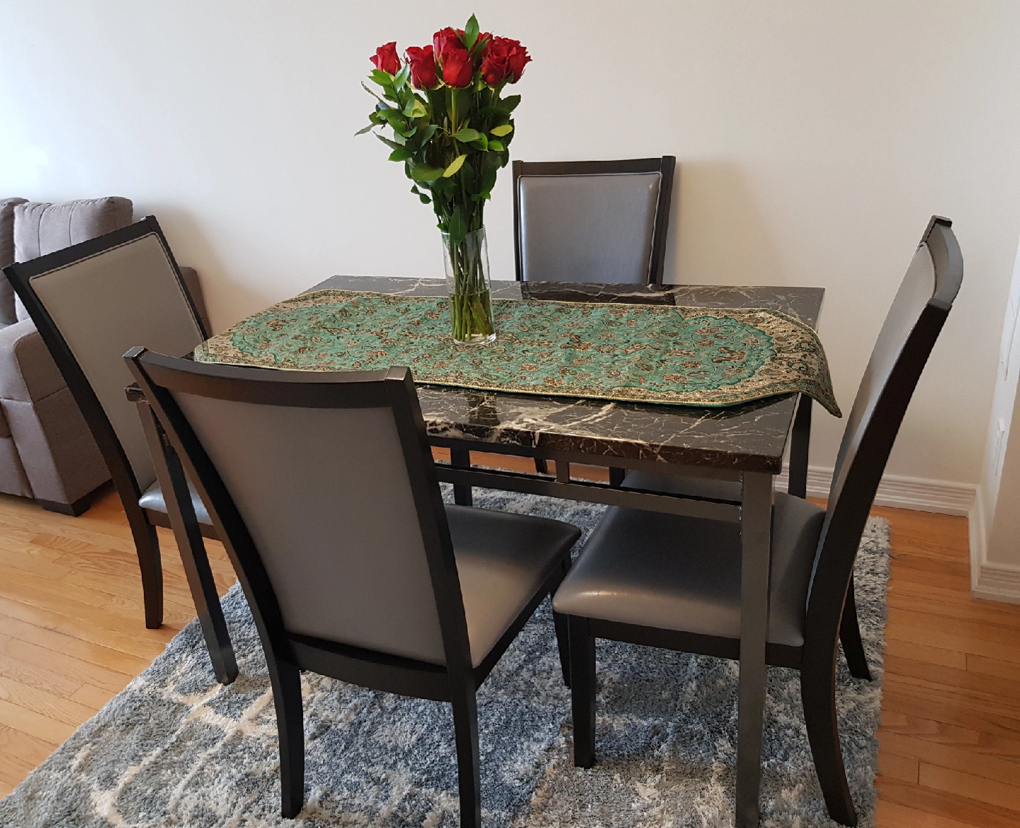 Selling a dining table with four chairs. The table has a marble-look top and the chairs have grey cushions. Perfect for a small dining area or kitchen!