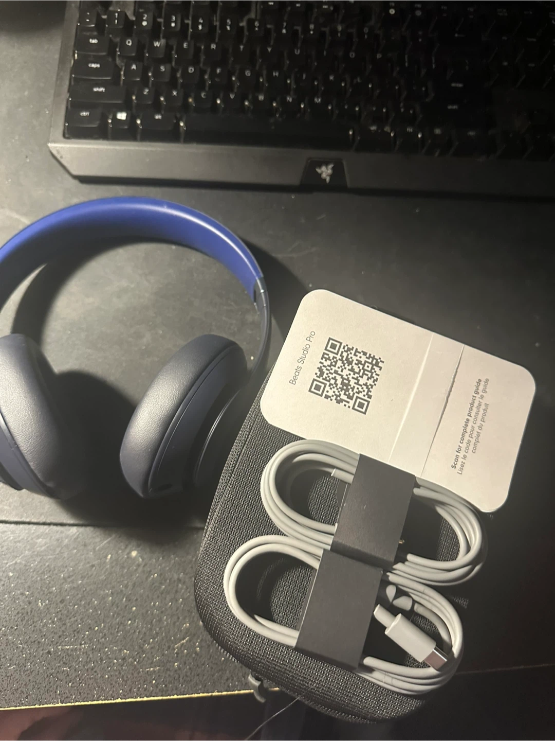 Selling a pair of Beats Studio Pro headphones in navy. They come with the original box and all included components, like the charging cable. Great for listening to music or podcasts on the go!