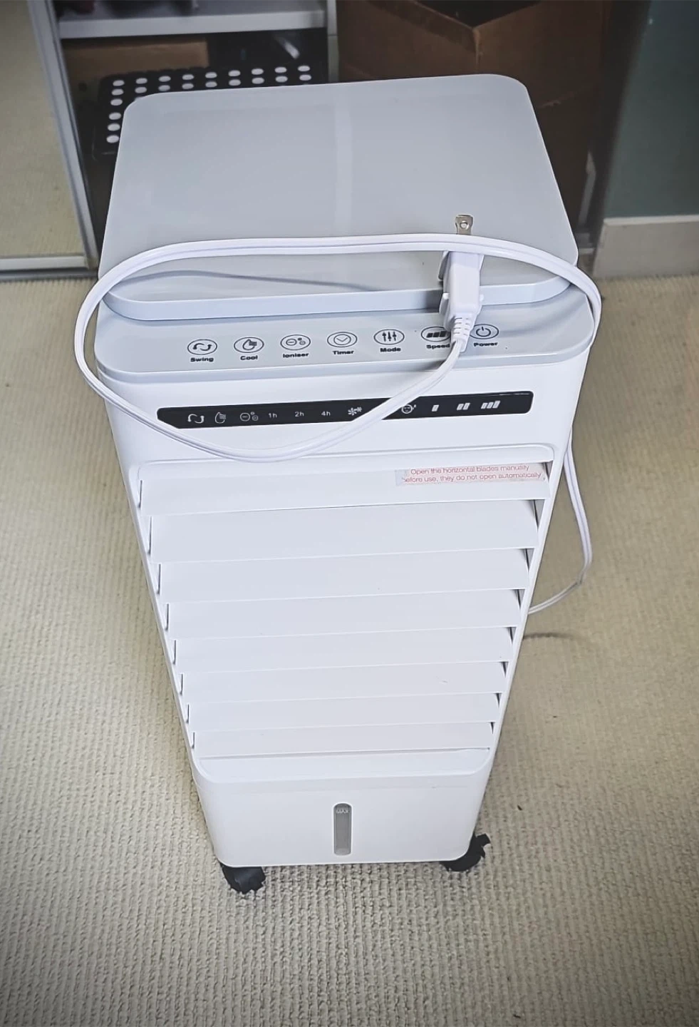 Selling a portable air cooler in great condition! It features swing, cool, ionizer, timer, and mode settings. You can set the timer for 1, 2, or 4 hours. It also has horizontal blades that you need to open manually before use