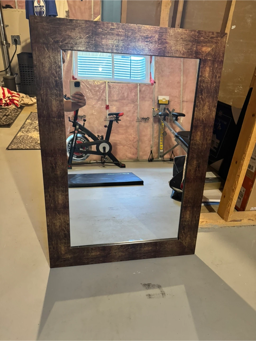 62Selling a large mirror with a wooden frame. It measures approximately 26 inches wide and 37 inches tall. It's in excellent condition and ready to brighten up your Can meet in Windermere and Terwillegar area as well!