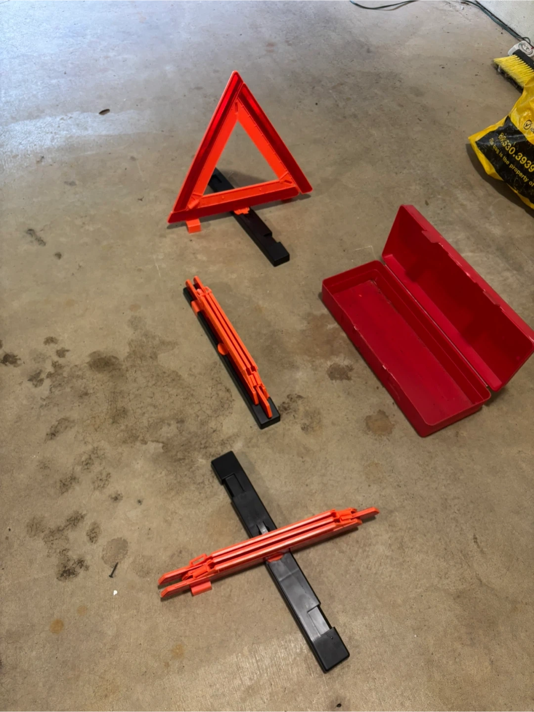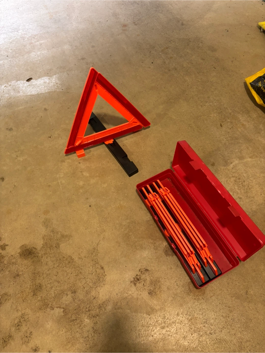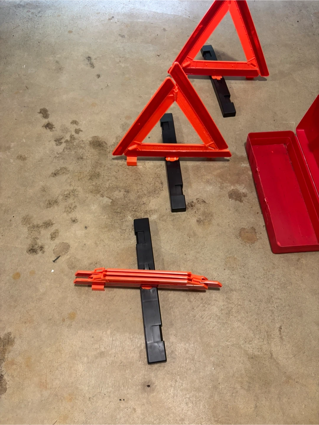 60Selling a set of emergency warning triangles. These are great to have in your vehicle for safety. They come in a convenient red storage case, so they're easy to store and keep organized in your trunk. Perfect for roadside emergencies!