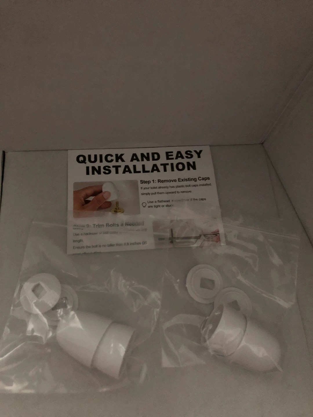 New, white toilet bolt caps. There 2 sets (4 caps in total), sealed in their packages.