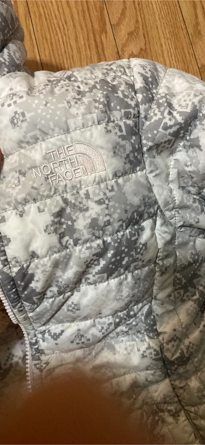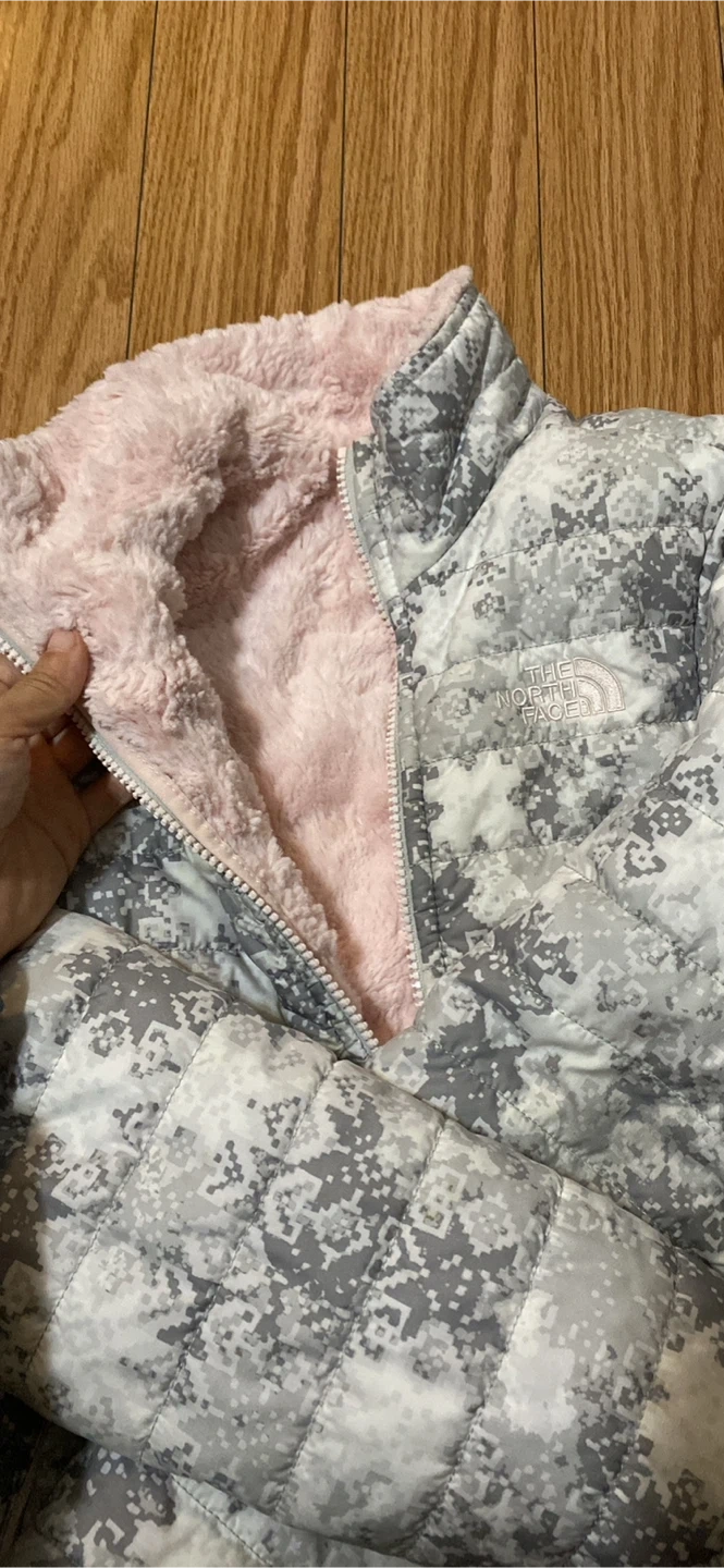 85Selling a The North Face reversible jacket. One side is grey with a digital camo-like pattern, and the other is soft pink fleece. It is in great condition.