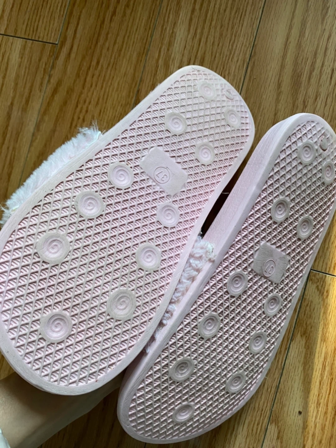 85Cute and comfy Kawai slides in a soft pink colour! They feature a furry strap and are a women's size 6. Perfect for lounging around the house or adding a touch of fun to your outfit