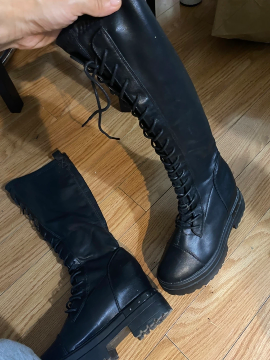 Selling a pair of stylish black lace-up knee-high platform boots! They're in great condition and ready for a new home. These boots are perfect for adding a bit of edge to any outfit and are sure to turn heads.