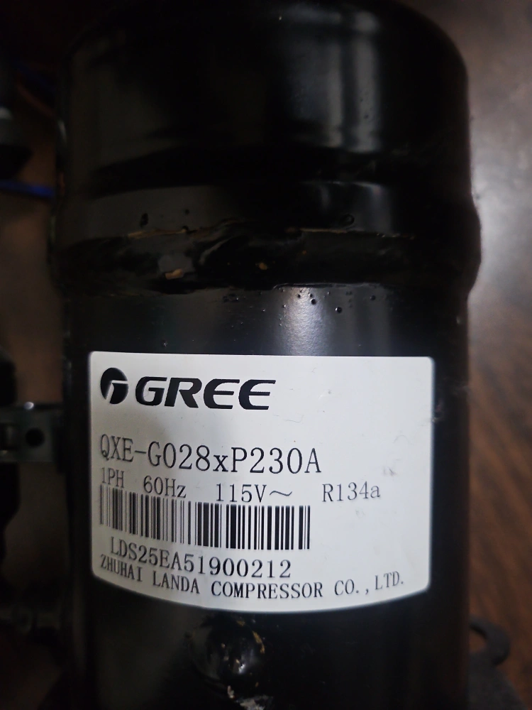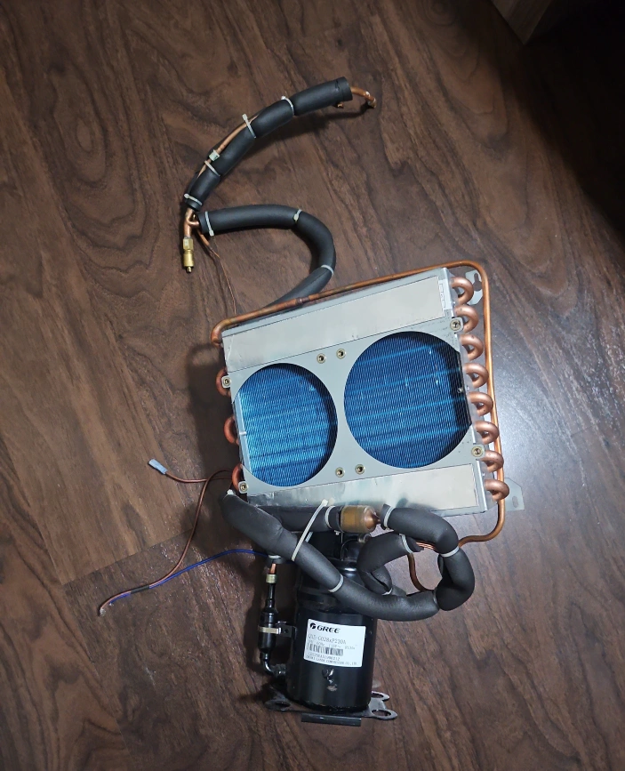 Fully sealed and charged R134a refrigeration system with Gree rotary compressor (115V, 60Hz). Includes evaporator coil, condenser coil, capillary tube, copper lines, and insulated tubing. Great for DIY mini-AC, water chiller, PC cooling projects, or HVAC learning. Removed from a working unit.
