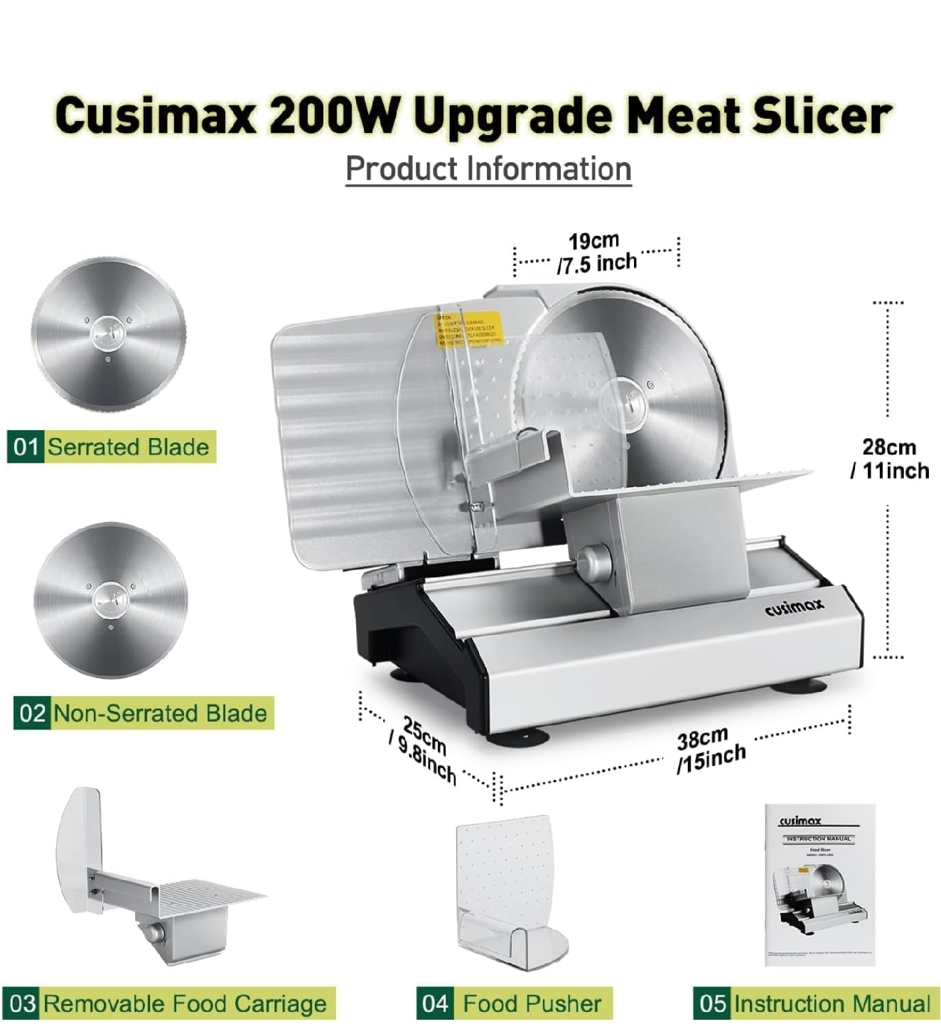 Looking for a reliable kitchen helper? This Cusimax meat slicer is perfect for slicing various foods with adjustable thickness from 0-20mm. It comes with both serrated and non-serrated blades, a removable food carriage, and a food pusher. The dimensions are approximately 19cm (7.5 inches) wide, 28cm (11 inches) high, and 38cm (15 inches) deep. Also includes the instruction manual!