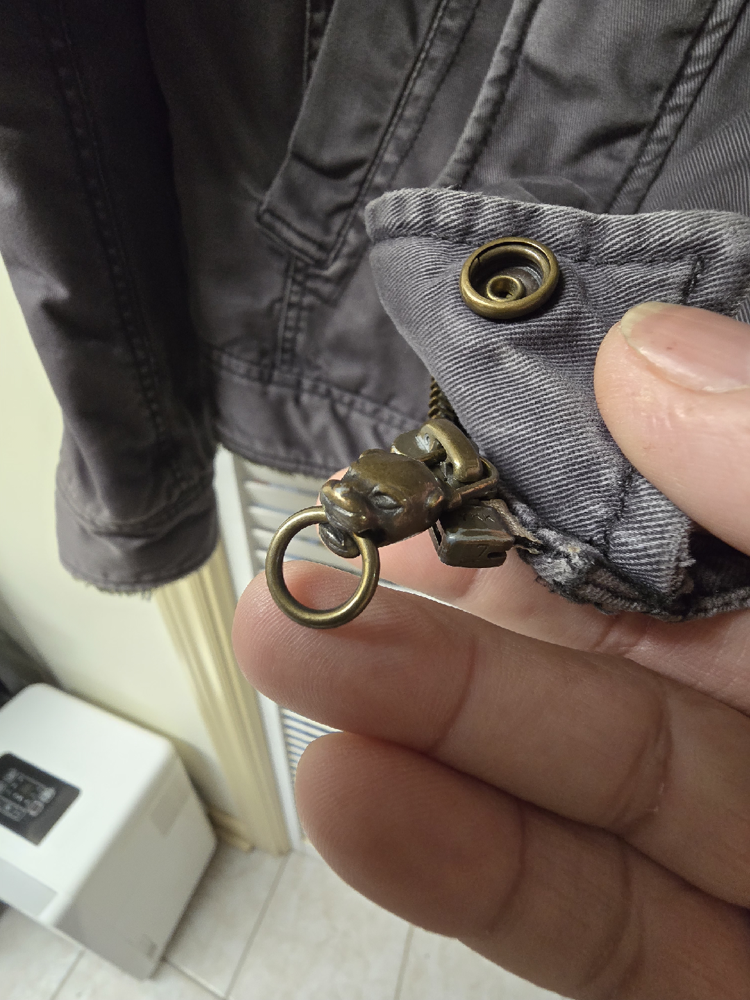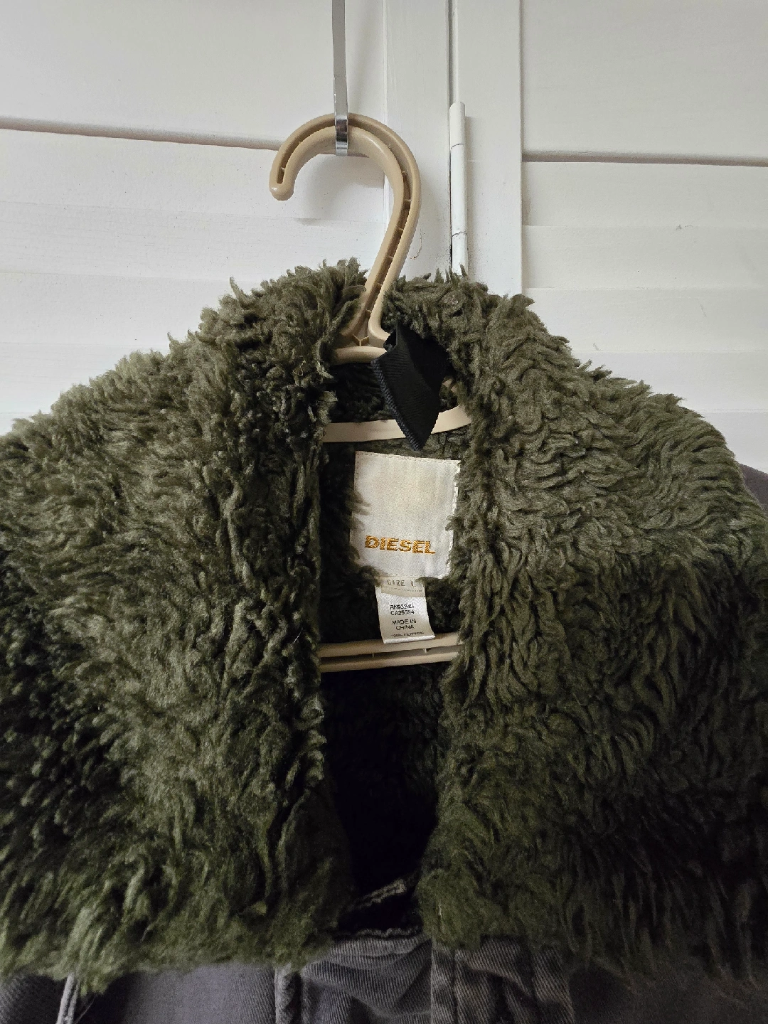 Diesel jacket featuring a faux fur collar. The jacket is a size L and has a unique zipper pull. It's in great condition and ready for a new home!