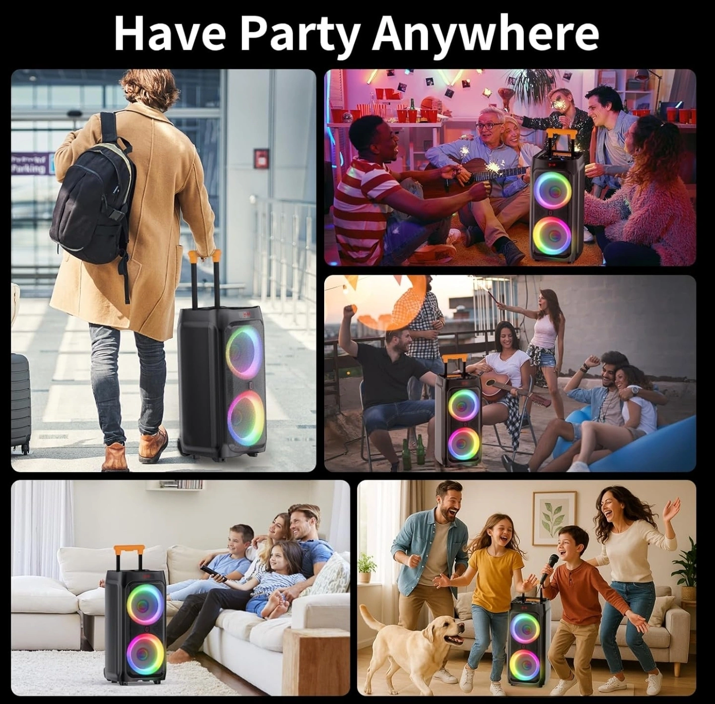 Get ready to party anywhere with this portable karaoke speaker! It features dual subwoofers and tweeters for excellent sound quality. You can connect via TF card, USB, or Aux in. It also comes with karaoke functionality for hours of fun!