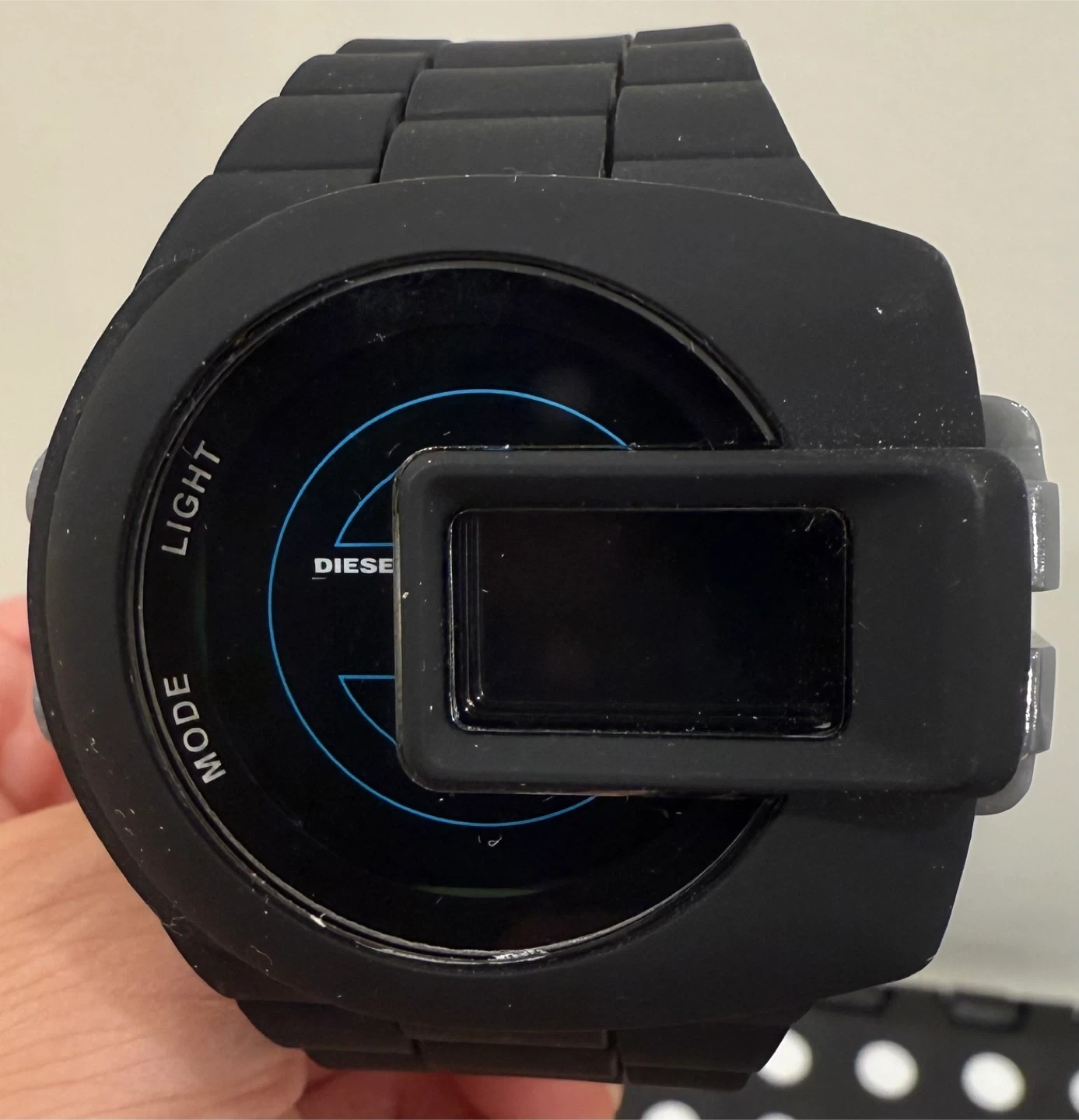 26Sleek and bold Diesel “ViewFinder” digital watch featuring a unique futuristic design. Perfect for collectors or anyone who loves statement timepieces with a modern edge. Features: - Black digital display with backlight - Rubber strap & durable - Water resistant up to 50m (165 ft) Minimal wear, excellent condition overall — just needs a new battery to get running again.