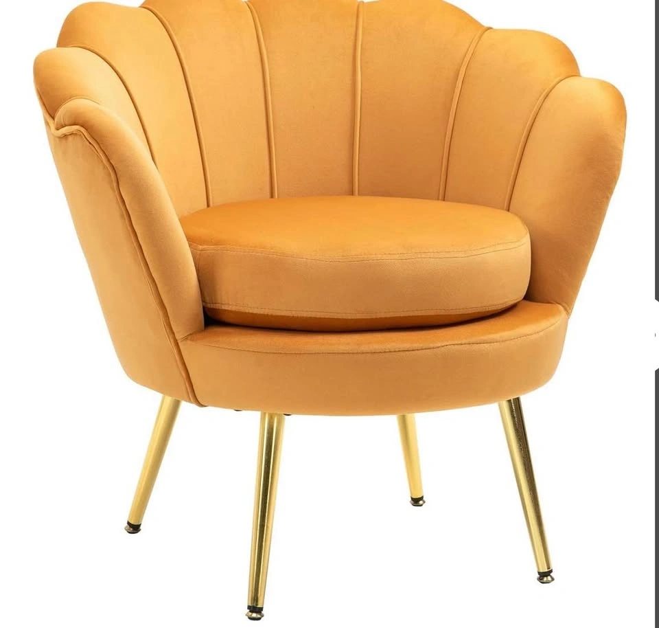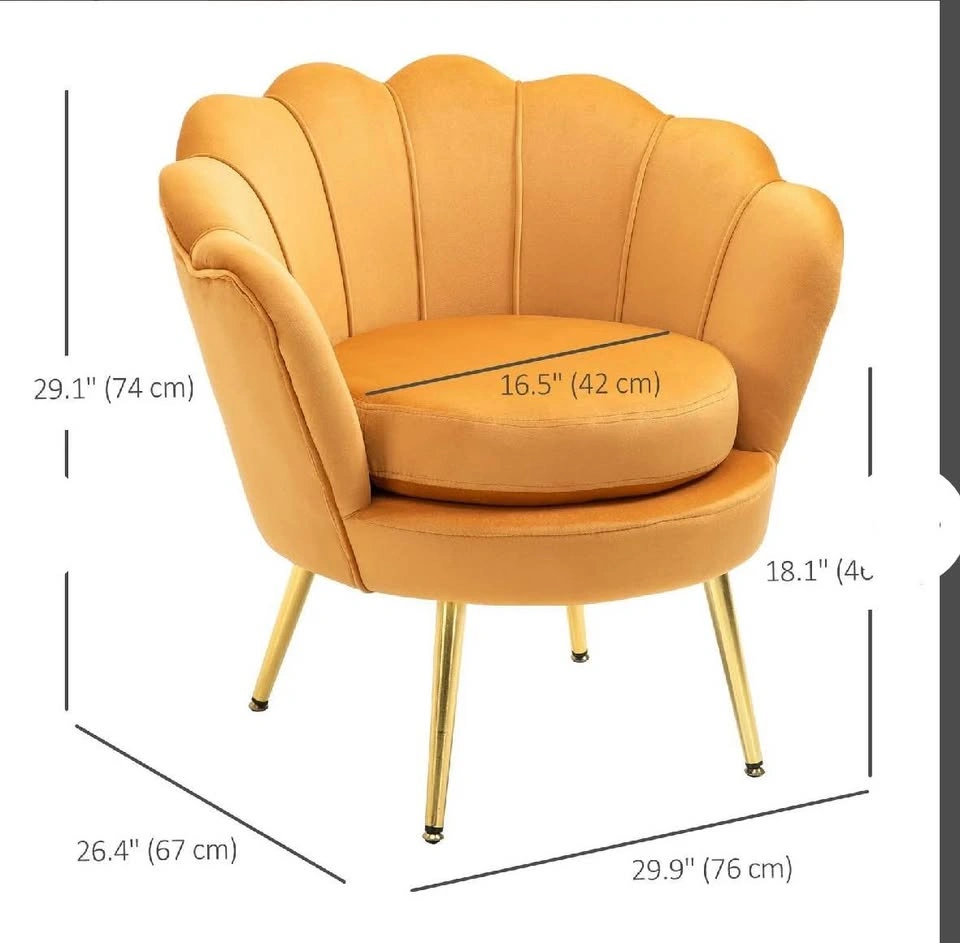 223New open box item. Expect minimum to no sign or scratch but no damages. Mid-century meets modern with a lotus-inspired backrest and golden legs. - Plush velvet polyester cushions with reinforced stitching for lasting support - Relax-ready with padded seat, armrests, and mid-back design - Adjustable feet prevent slipping and protect your floors - Perfect for home office, reading nook, or upscale entryway - Seat Height: 46cm | Seat Depth: 50cm | Max Weight: 330 lbs