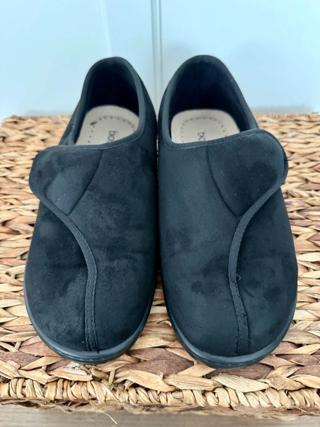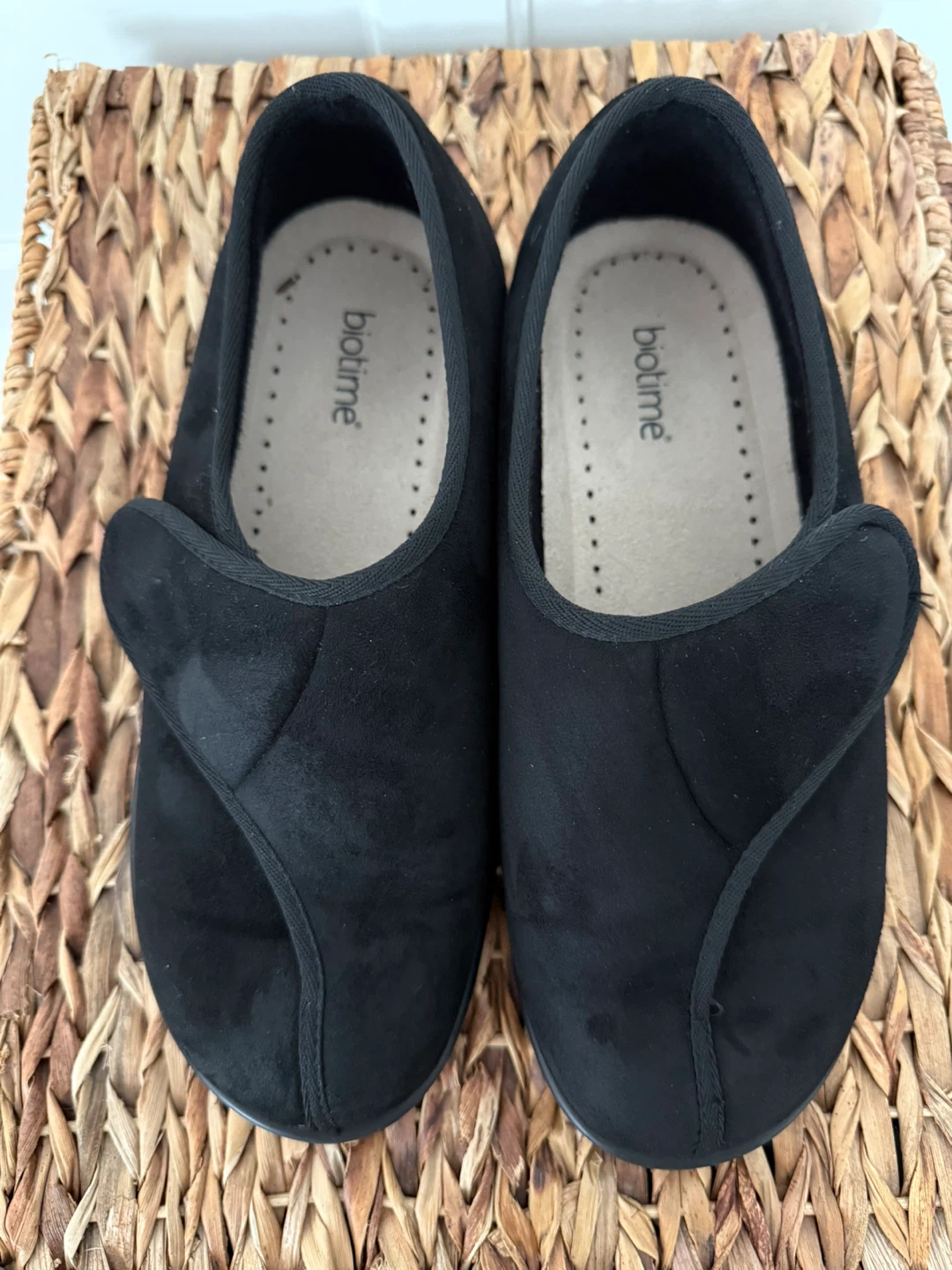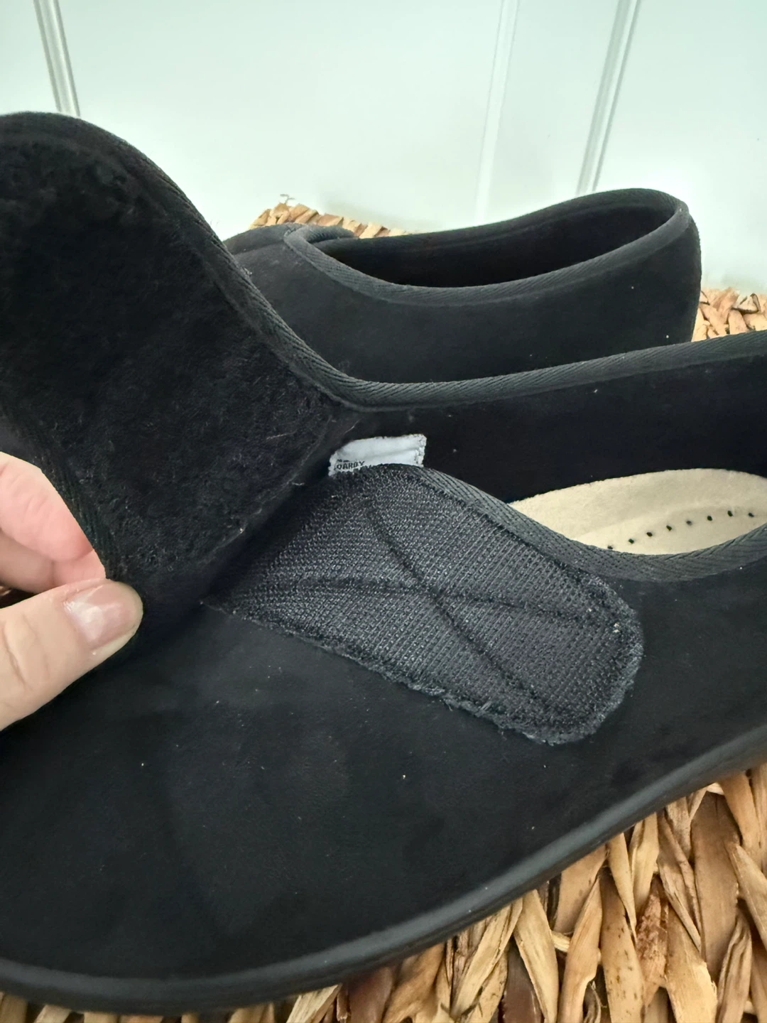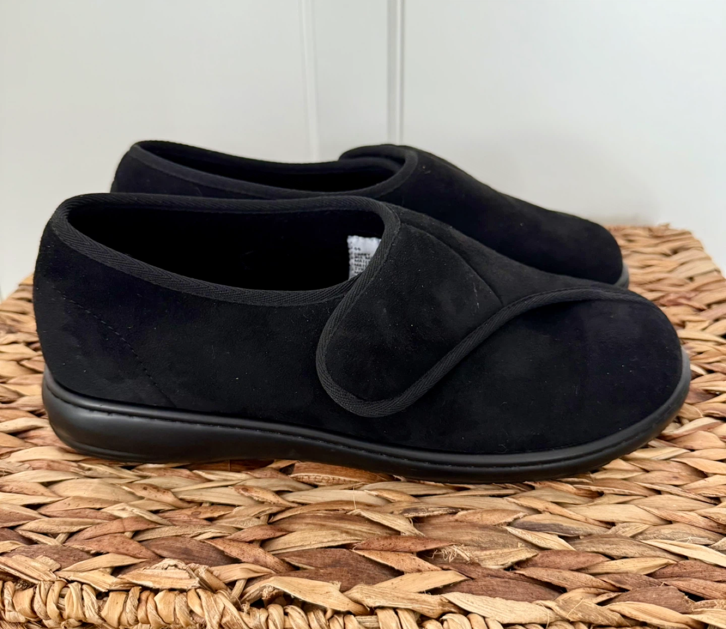Adjustable Velcro® strap closure opens wide for easy on and off, as well as provide snug fit and hold feet in place.