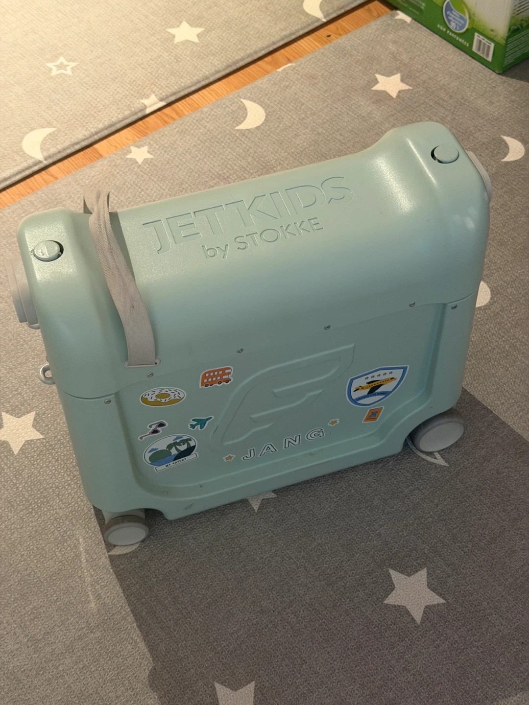 Selling a Jetkids by Stokke ride-on suitcase in a lovely mint green colour! This suitcase is perfect for travelling with kids, as they can ride on it through the airport. It's in used condition and ready for new adventures