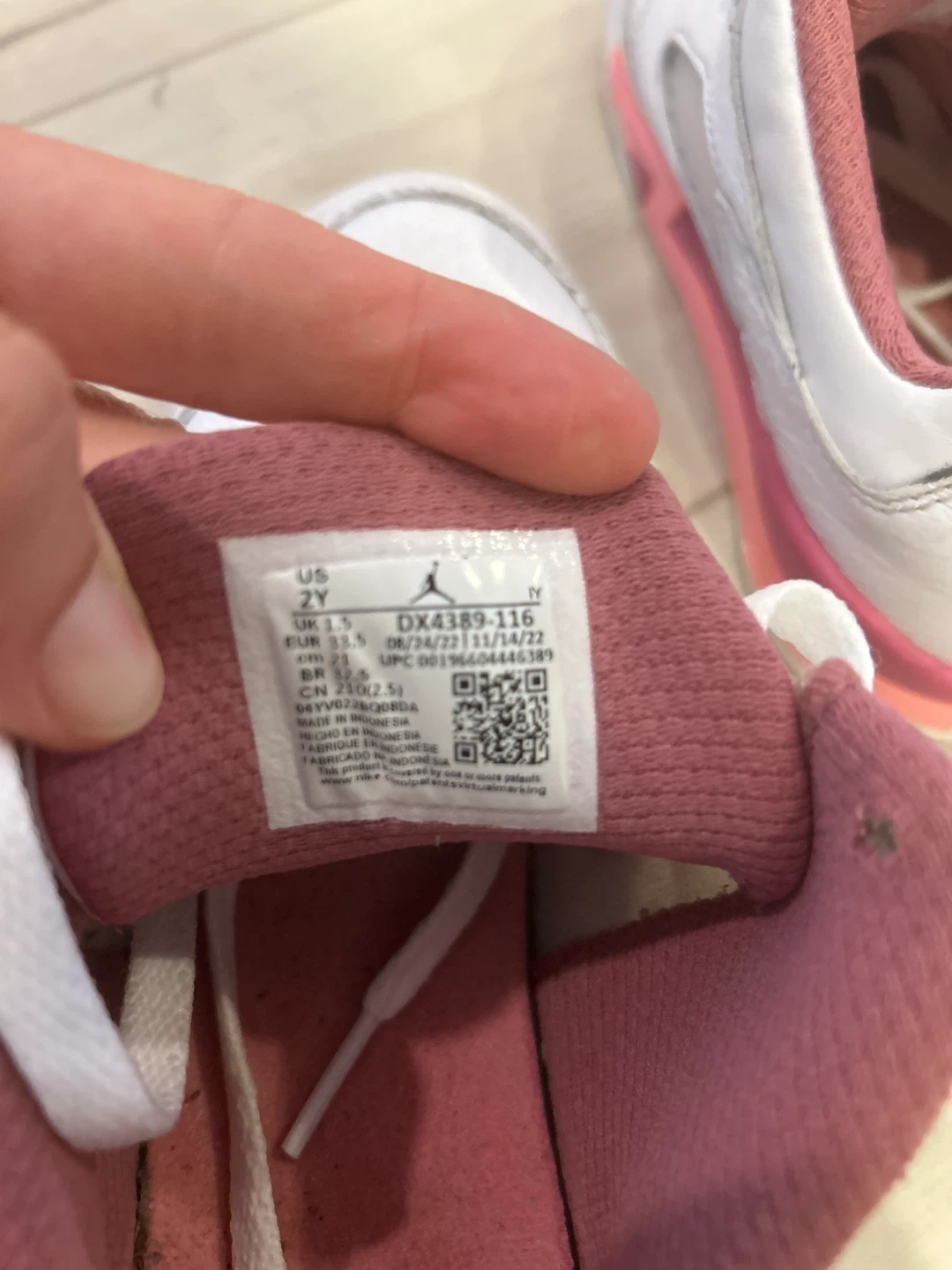 Selling a pair of Jordan 5 Retro sneakers in white and pink. These are youth size 2Y. The style code is DX4389-116. They were manufactured on 2022 November 14.
