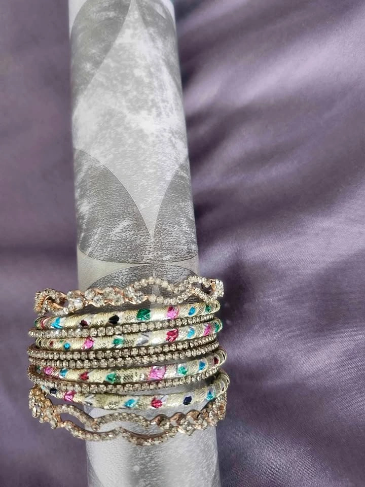 Stack of bangles, with decorative elements. Features rhinestone accents and patterned detailing. A lovely accessory that can add sparkle to your day.
