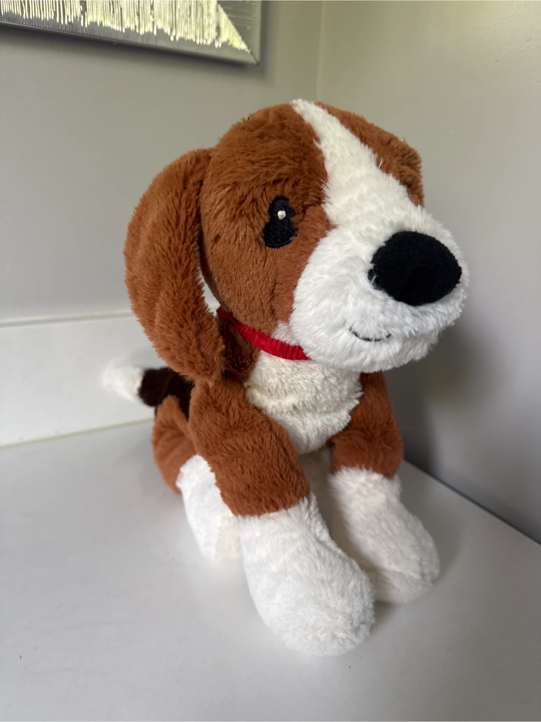 Selling a super cute plush puppy! It's in great condition and ready for a new home. The puppy has brown and white fur, a red collar, and a sweet expression. Perfect for kids or anyone who loves cuddly toys