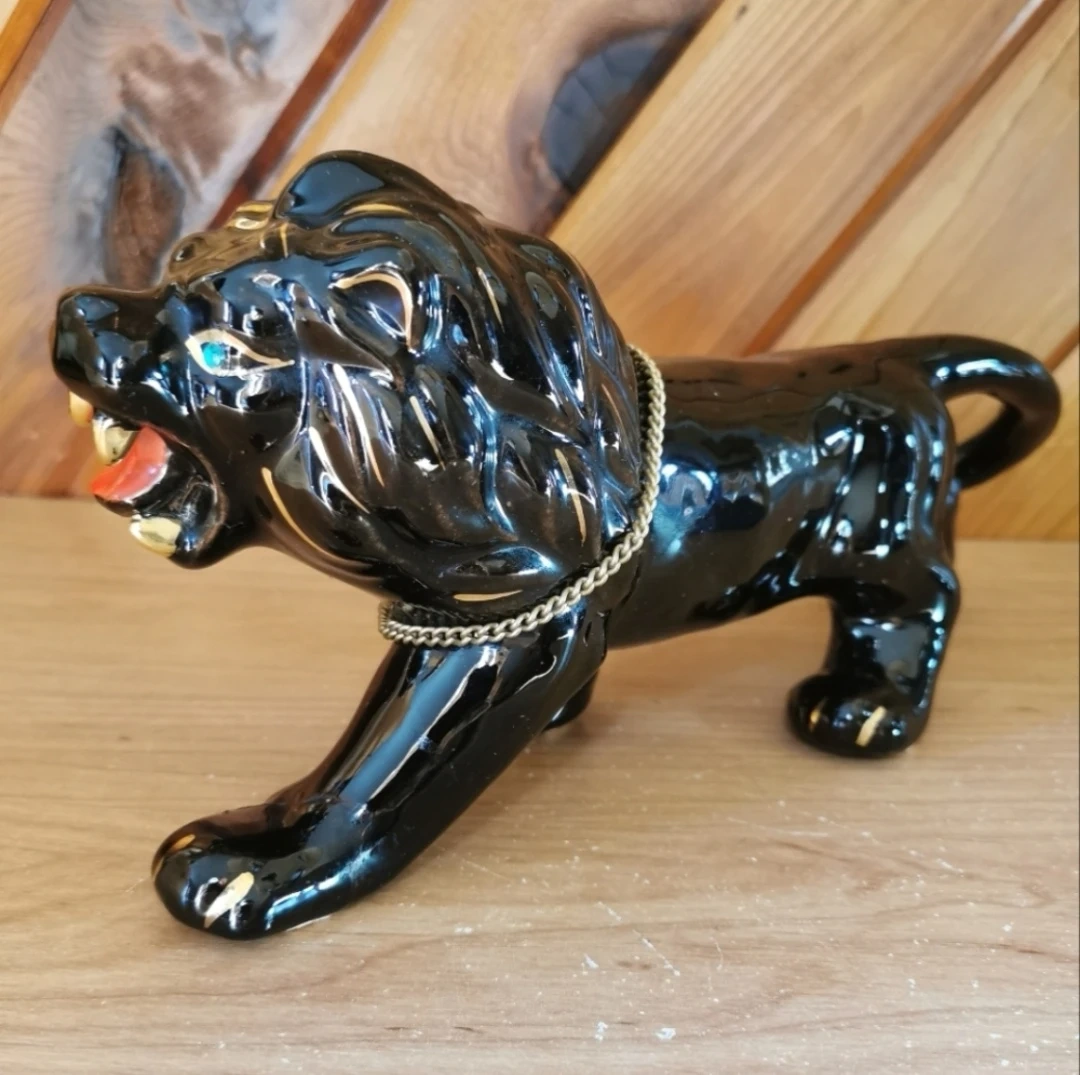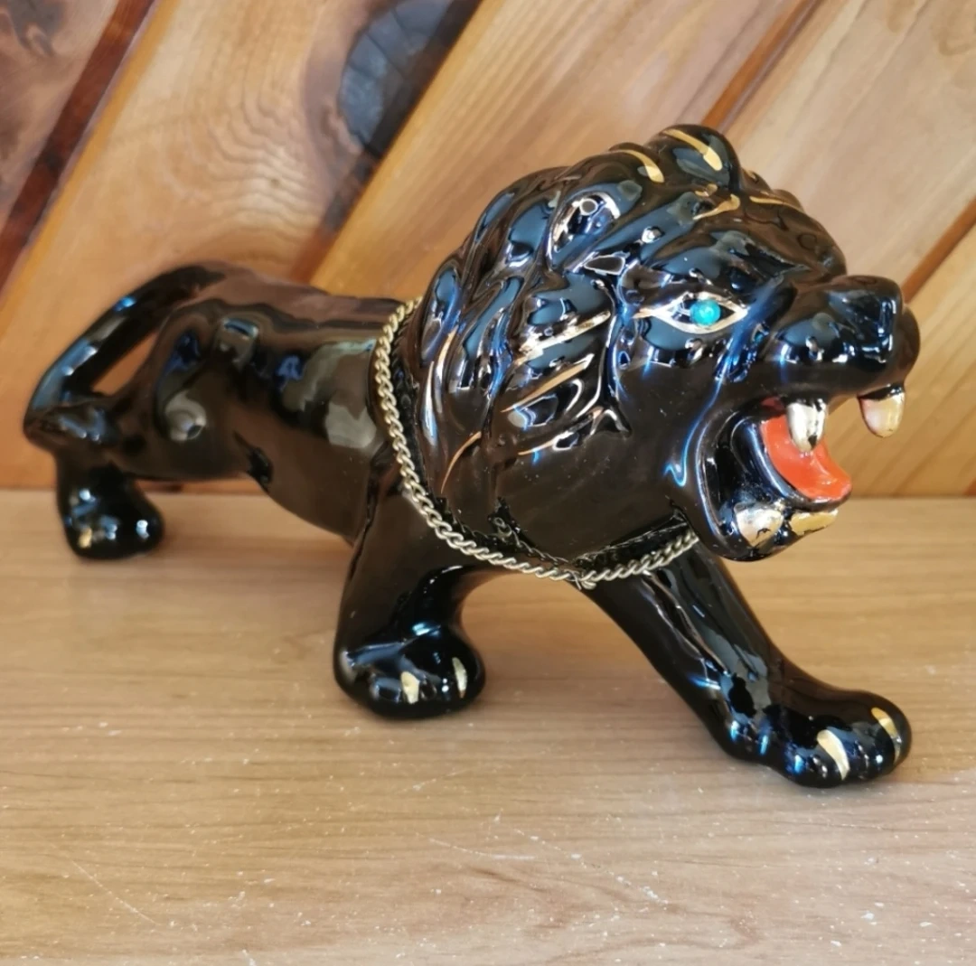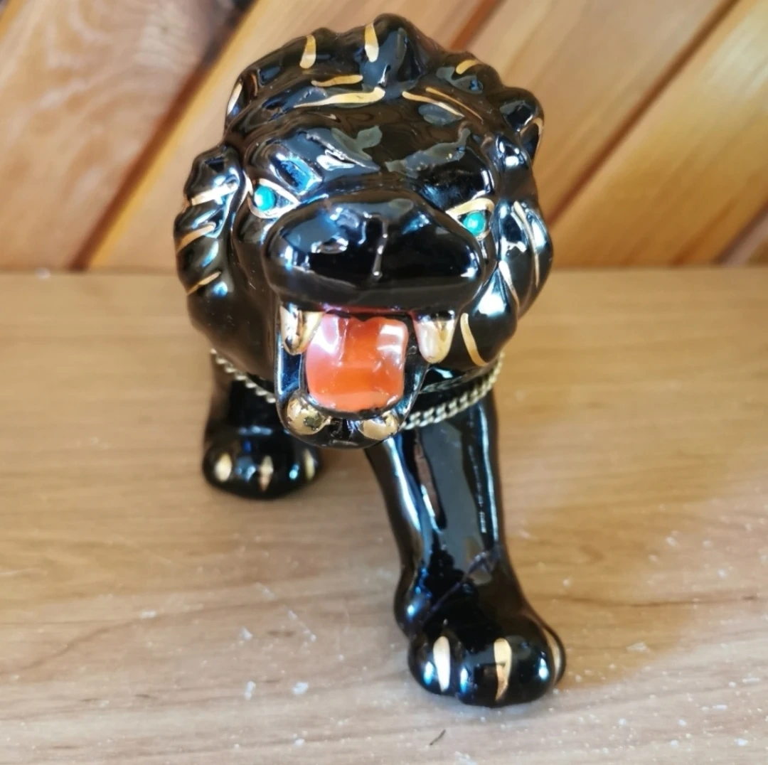 94Vintage Black Lion with Green Jewel Eyes and a Chain Necklace Gorgeous collectible piece, Made in Japan, hand painted, about 11 inch long, 4 inch tall, has tiny little hardly visible scratch on one paw, other than that in great condition, rare find Pick up downtown Calgary, parking available, cash only please