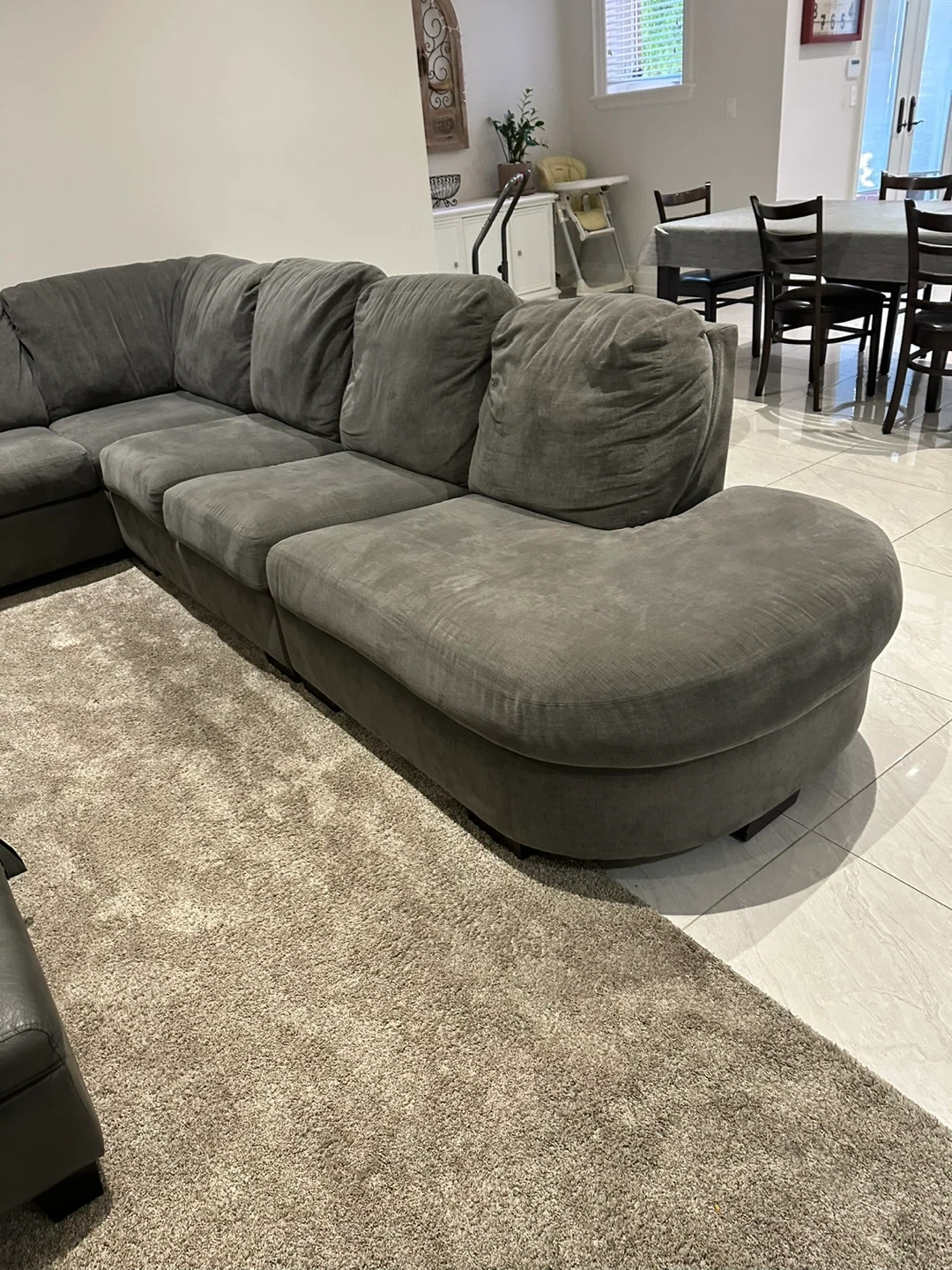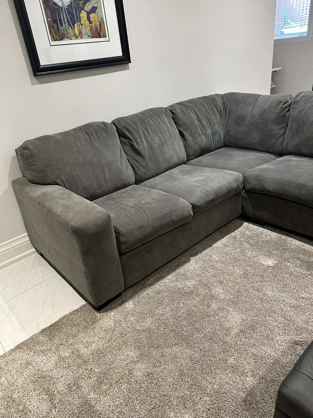 Selling a comfortable grey sectional sofa. The approximate dimensions are 95 inches in length, 38 inches in width, and 47 inches in depth. It's in good condition (minor defects).