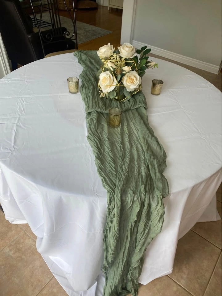 20Elevate your table cloth with these beautiful sage green cheesecloth table runners. $10 each or $5 to rent. 23 total available.