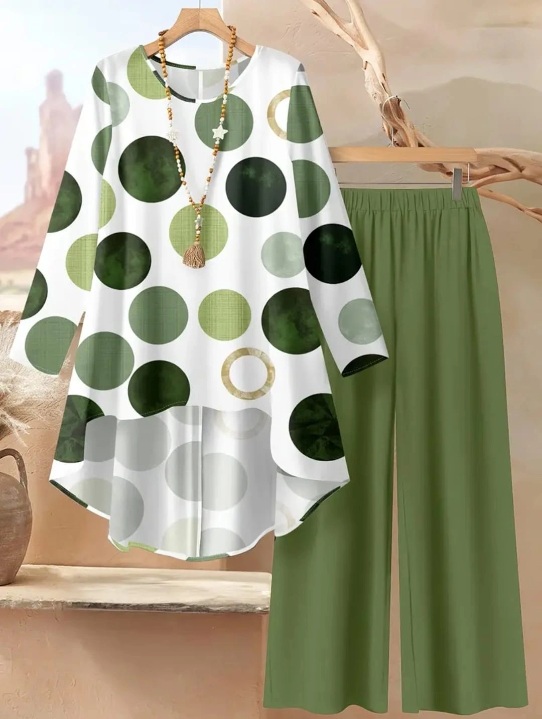 Here's a cute two-piece outfit featuring a top with a unique high-low hem and matching green pants! The top has a fun polka dot pattern in shades of green and white. Perfect for a casual day out or a comfy work-from-home look