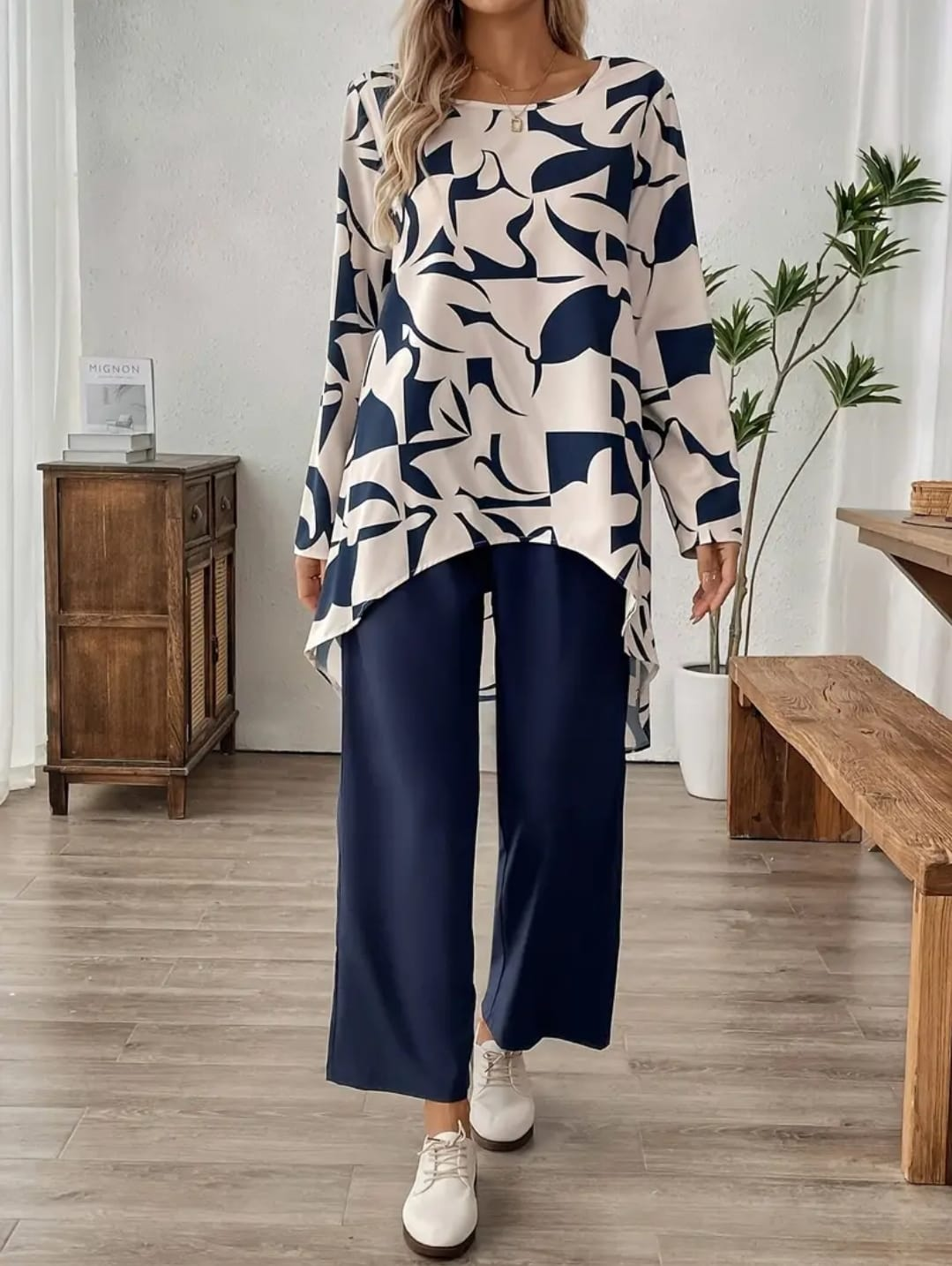Patterned Long Sleeve Top & Wide Leg Pants Set