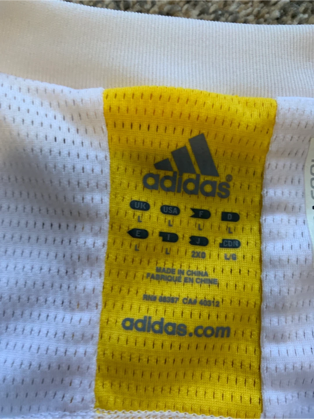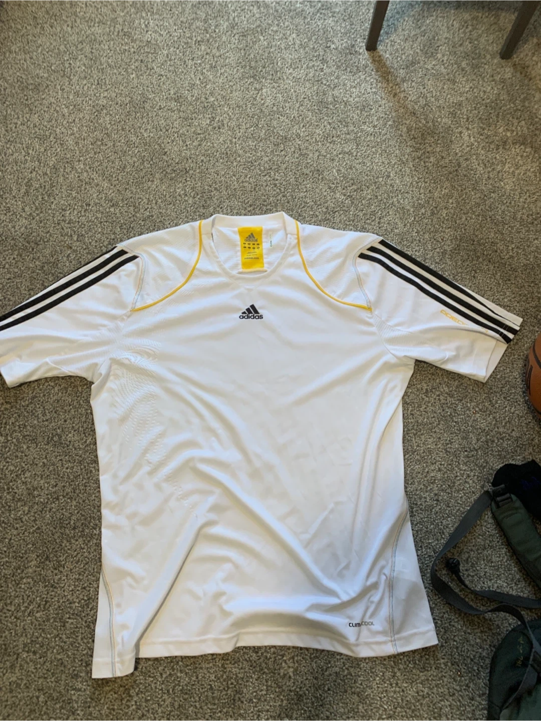 Selling an Adidas t-shirt in white with yellow accents! It's a size L and features the classic Adidas stripes on the sleeves. Great for sports or casual wear!