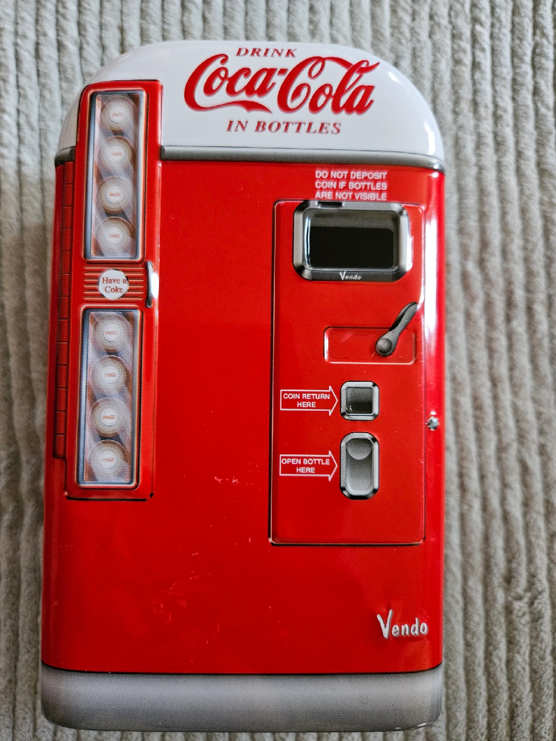 Selling a Coca-Cola Vendo vending machine tin. It's in great shape and perfect for collectors or anyone who loves vintage Coca-Cola memorabilia! It's a fun and unique piece to add to your collection or use for storage