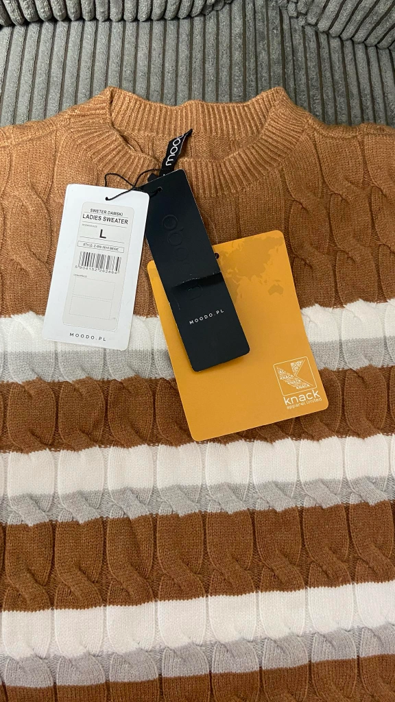 Cozy and stylish New Mooodo ladies sweater in size L! The sweater features a lovely brown and white striped pattern with a unique cable knit design. Perfect for adding a touch of warmth and style to your wardrobe!